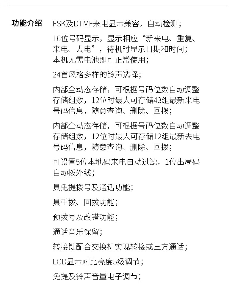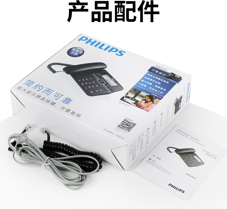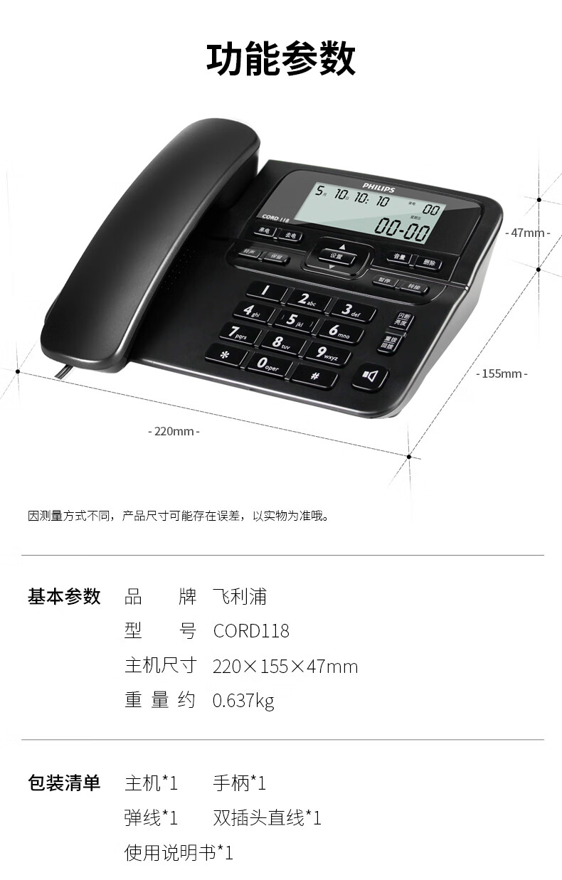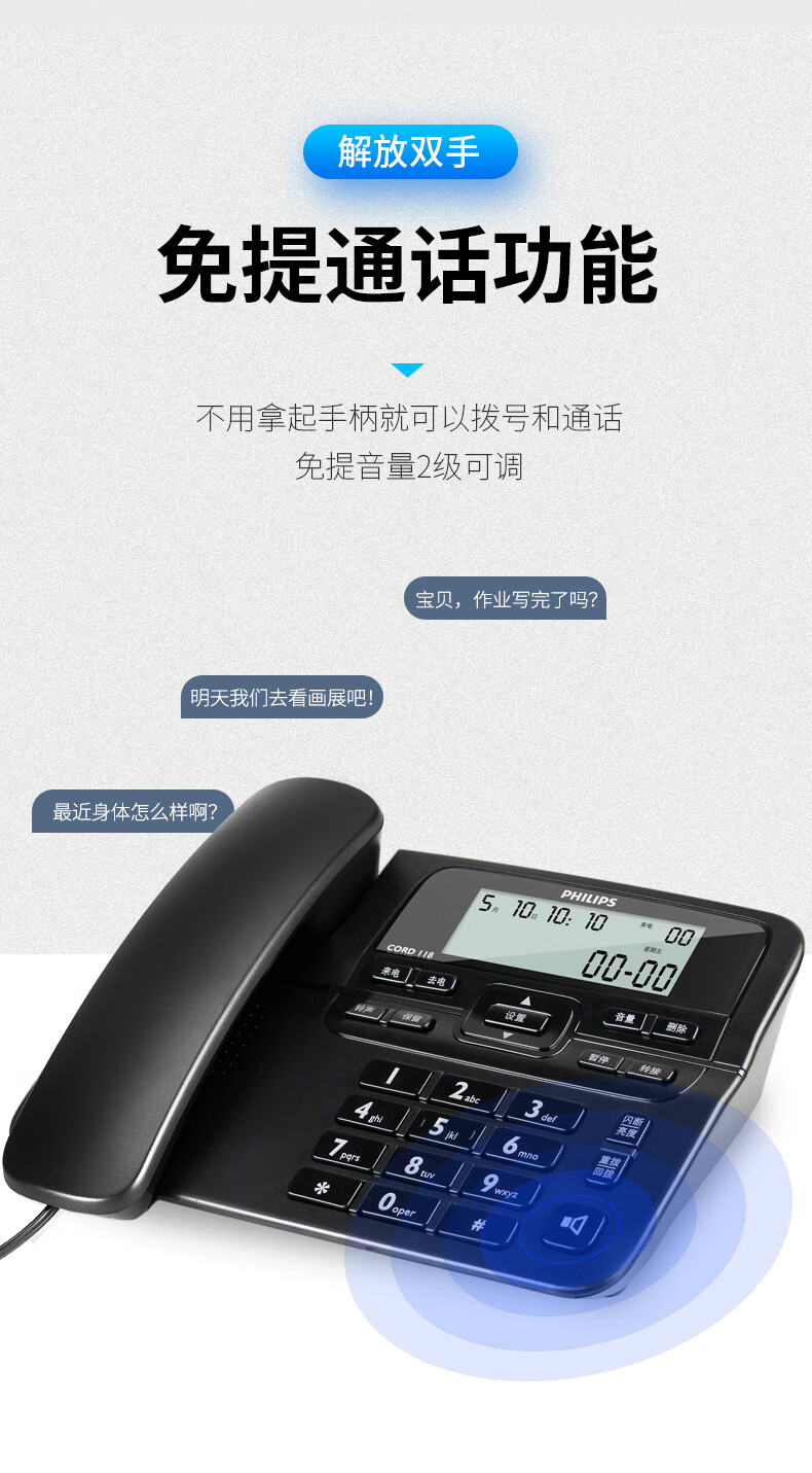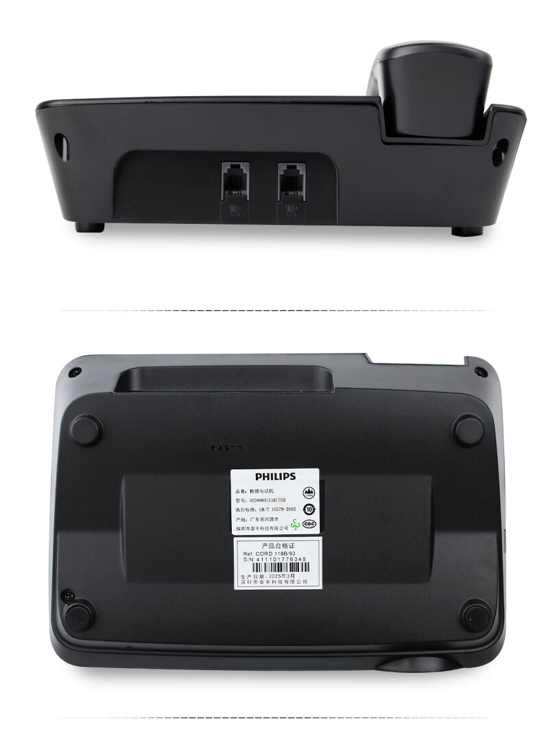 飞利浦/PHILIPS CORD118 普通电话机 电话机座机 固定电话 办公 有线电话 来电显示 双接口 免电池 CORD118黑色