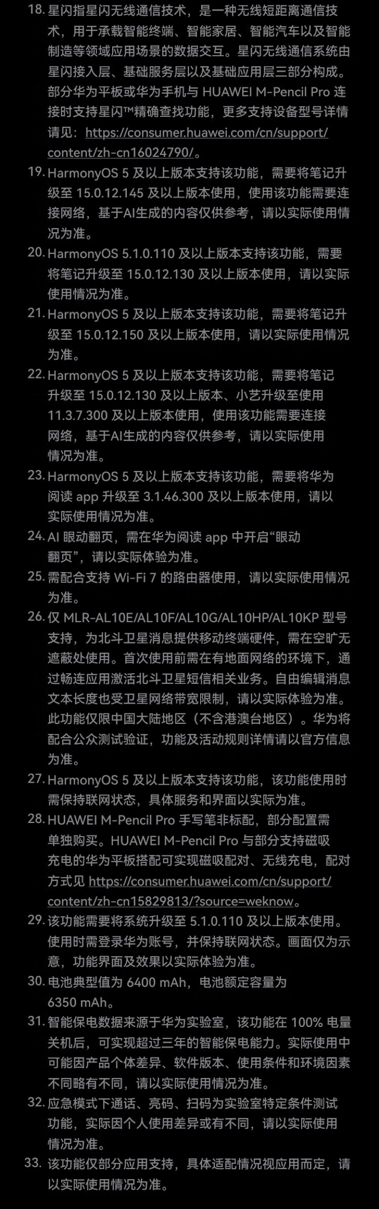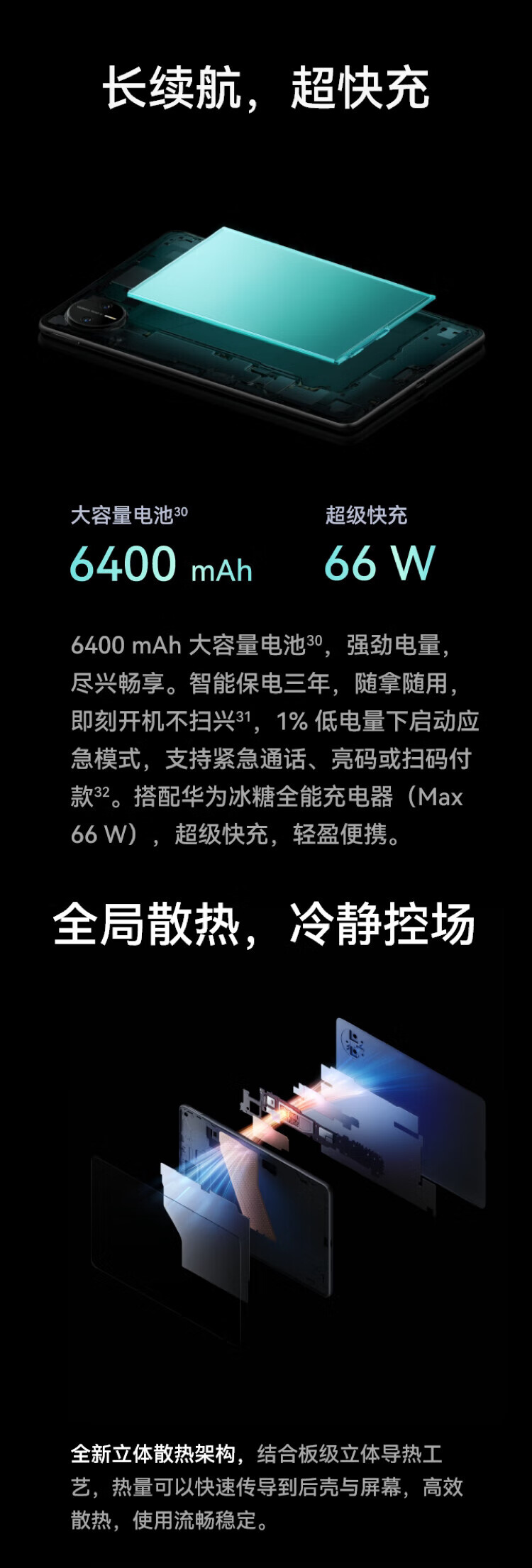 包装清单  :   平板(内置电池) × 1 2、快速指南 × 1 3、华为冰糖全能充电器(Max 66 W) × 1 4、Type-C 数据线 × 1