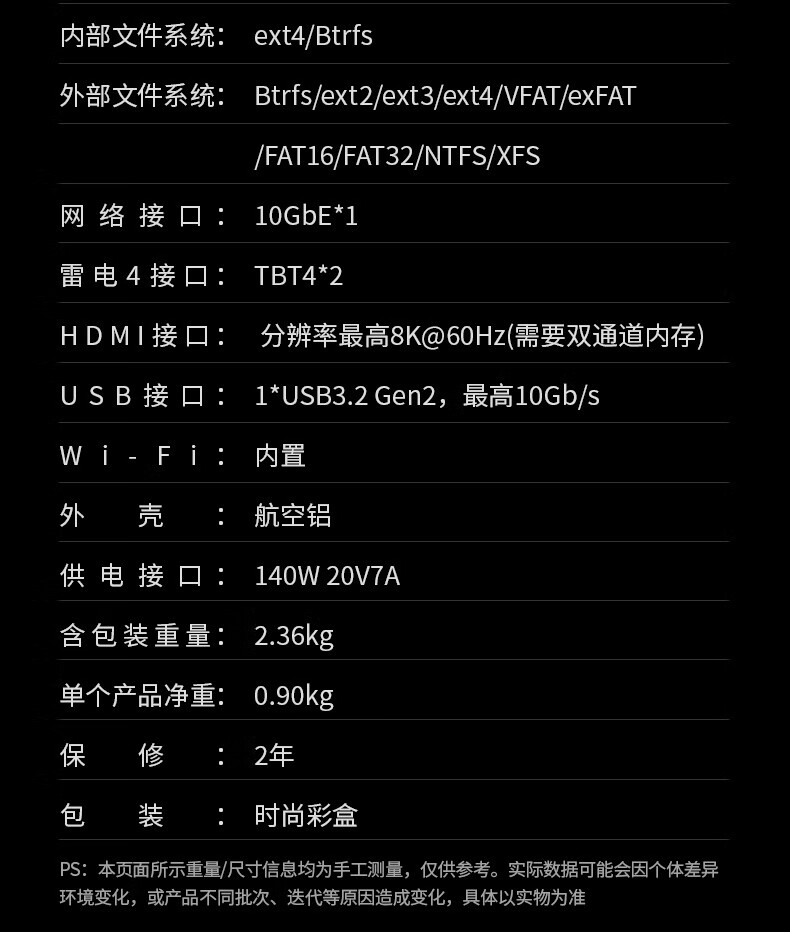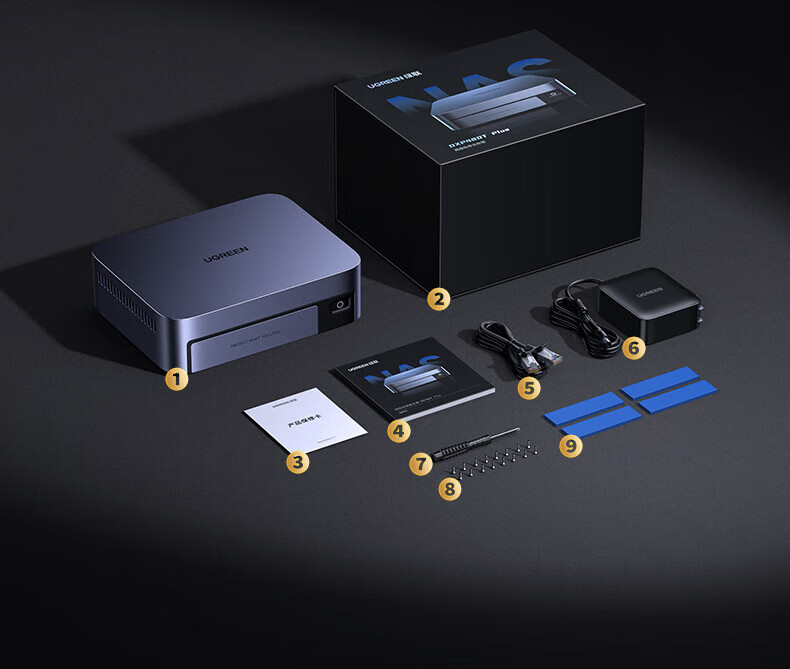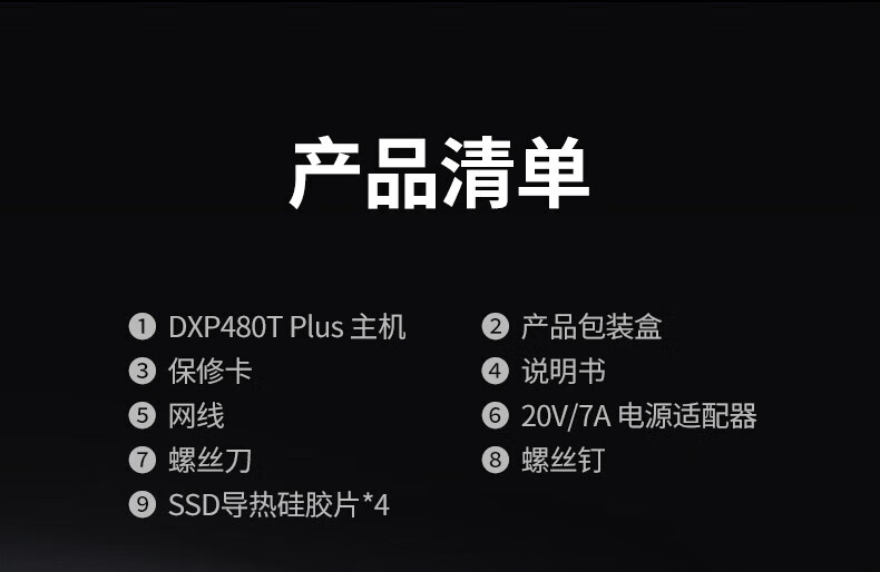 包装清单  :   DXP480T Plus 主机、保修卡、网线、螺丝刀、产品包装盒、说明书、20V/7A 电源适配器、螺丝钉、
