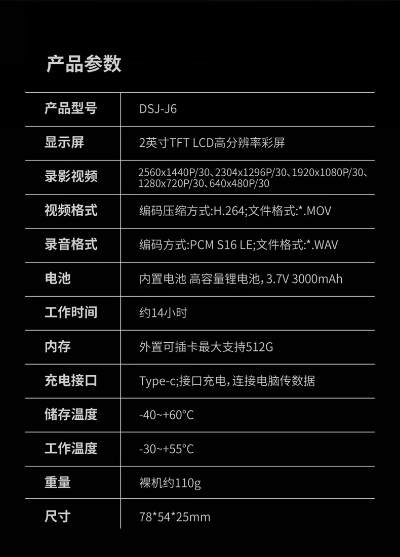京华/JWD DSJ-J6 通用无线电通信设备 执法记录仪DSJ-J6高清4K摄像红外夜视超长续航戴胸前录像 512G 78*54*25mm