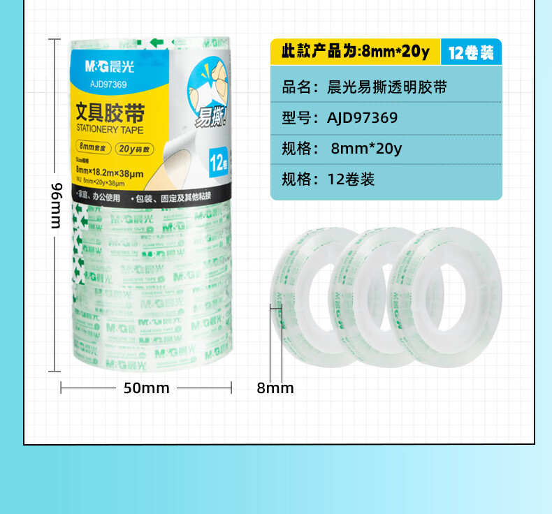 包装清单  :    8mm*20y透明文具胶带 高透易撕小胶带 学生手工胶布 12卷