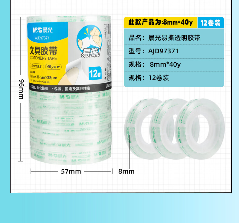 包装清单  :   8mm*40y透明文具胶带 高透易撕小胶带 学生手工胶布 12卷