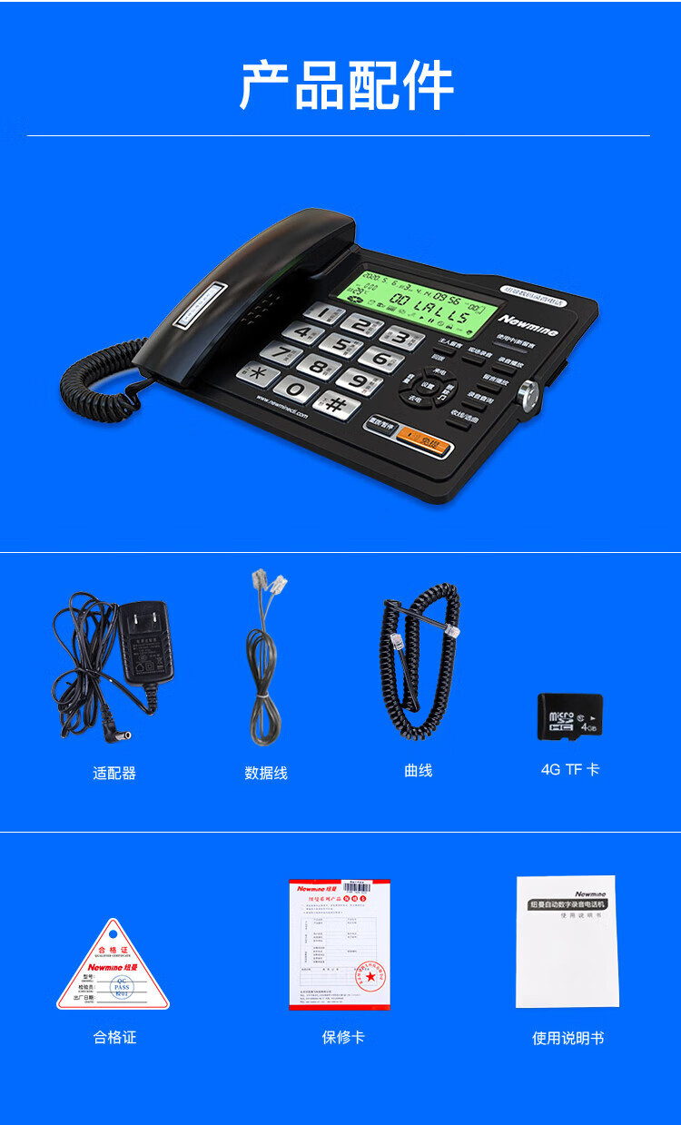 包装清单  :   电话机x1,适配器x1,手柄曲线x1,电话线x1,说明书x1,合格证x1,维修卡x1