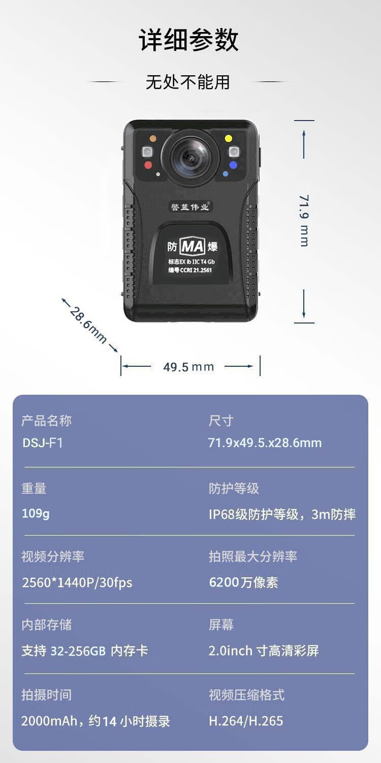 警蓝伟业 DSJ-F1 通用无线电通信设备 高清6200万像素14小时续航执法视音频记录仪 DSJ-F1防爆版 128G