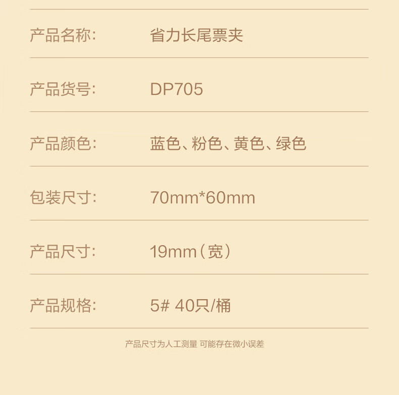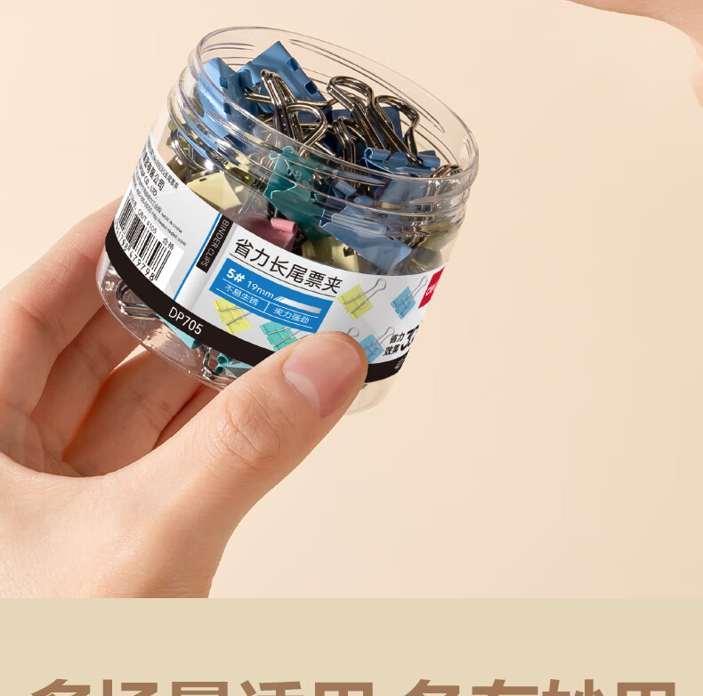 包装清单  :   省力长尾票夹5#19mm DP705 混 40枚/筒
