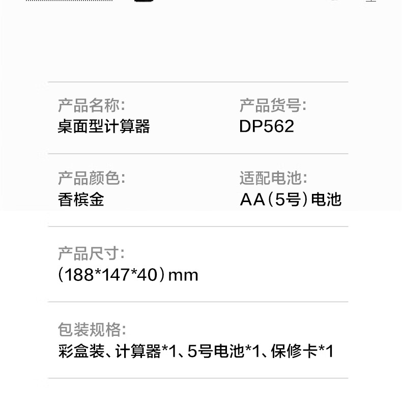 包装清单  :   桌面计算器 DP562 香槟金 台