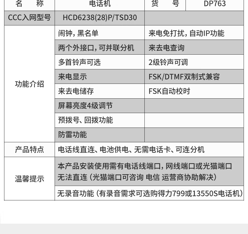 包装清单  :   电话机 DP763 黑 1台