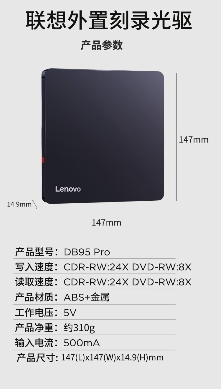 联想/LENOVO DB95pro 光驱 外置光驱8倍速DVD刻录机type-C USB2.0双接口移动刻录机