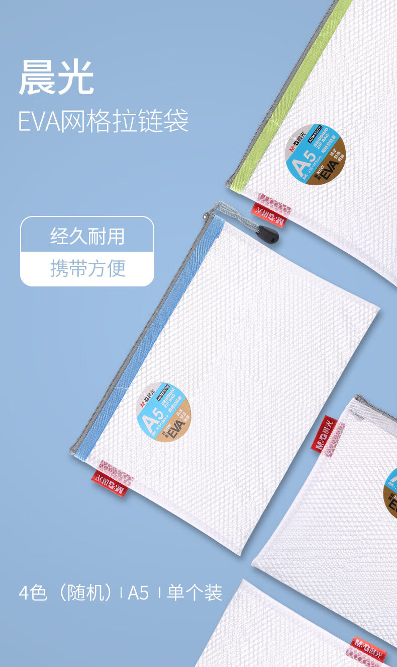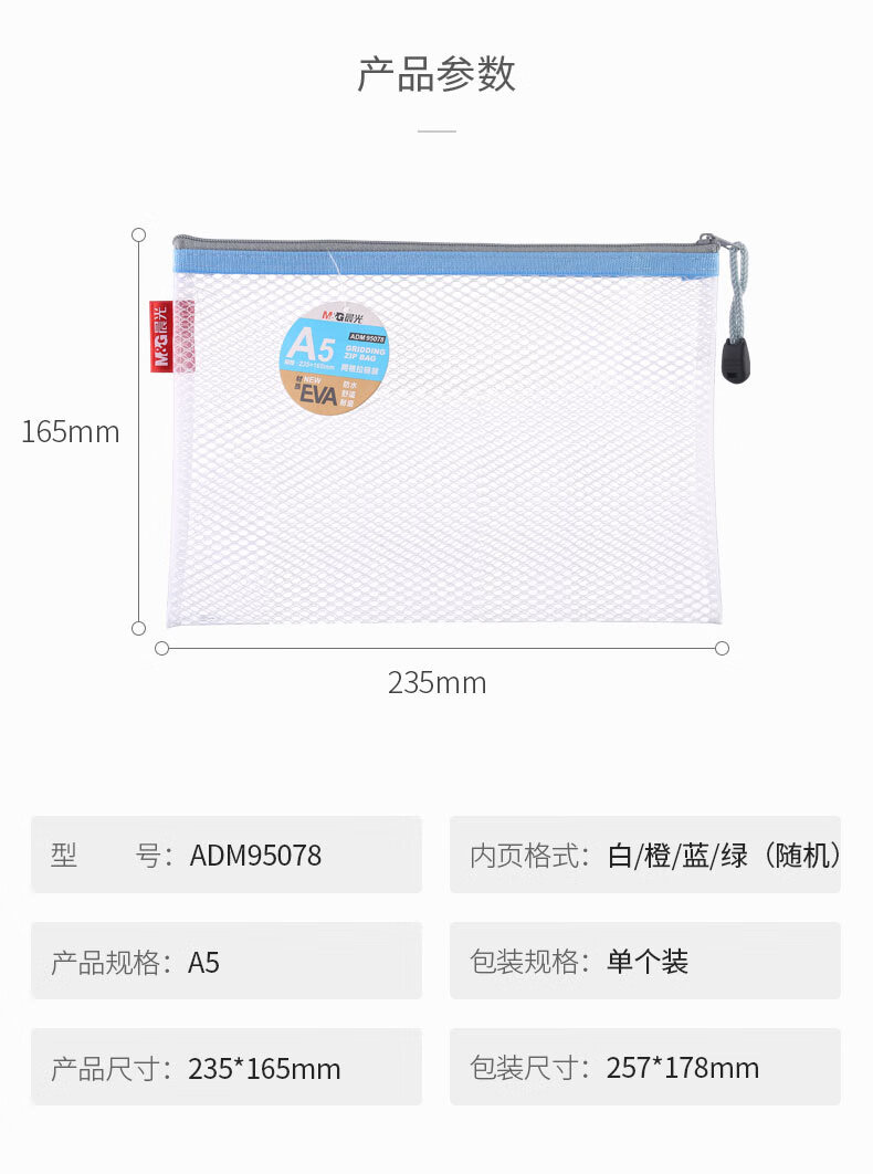 包装清单  :   A5/EVA文件袋资料袋 网格拉链袋 办公文件整理收纳袋 单个装颜色随机