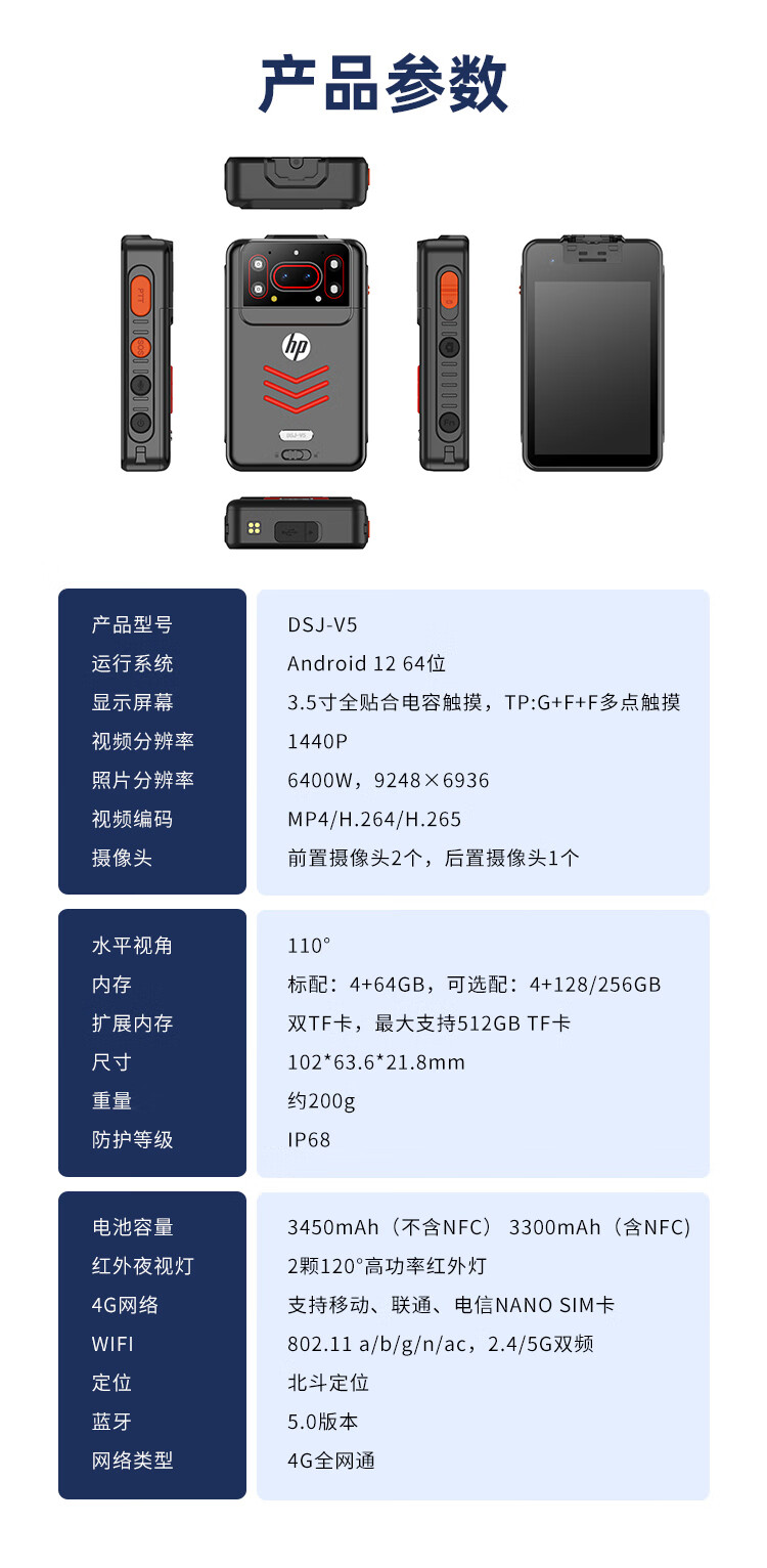 惠普/HP DSJ-V5 通用无线电通信设备 执法记录仪高清4G现场记录仪 黑色 128G