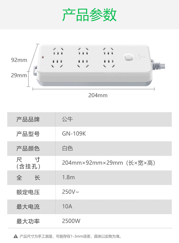 公牛/BULL GN-109K 插座 插座/插线板/插排/排插/接线板/拖线板 6位总控全长1.8米