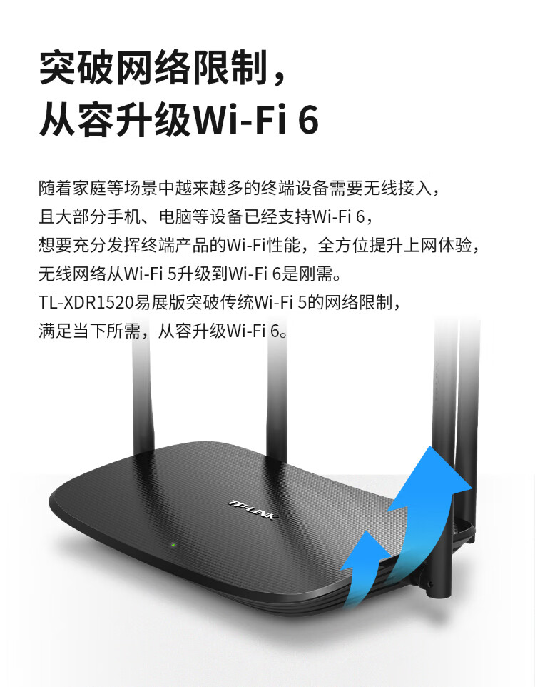 包装清单  :    AX1500双千兆新一代无线路由器 高速穿墙家用双频 凌云系列TL-XDR1520易展版 轻享WiFi6