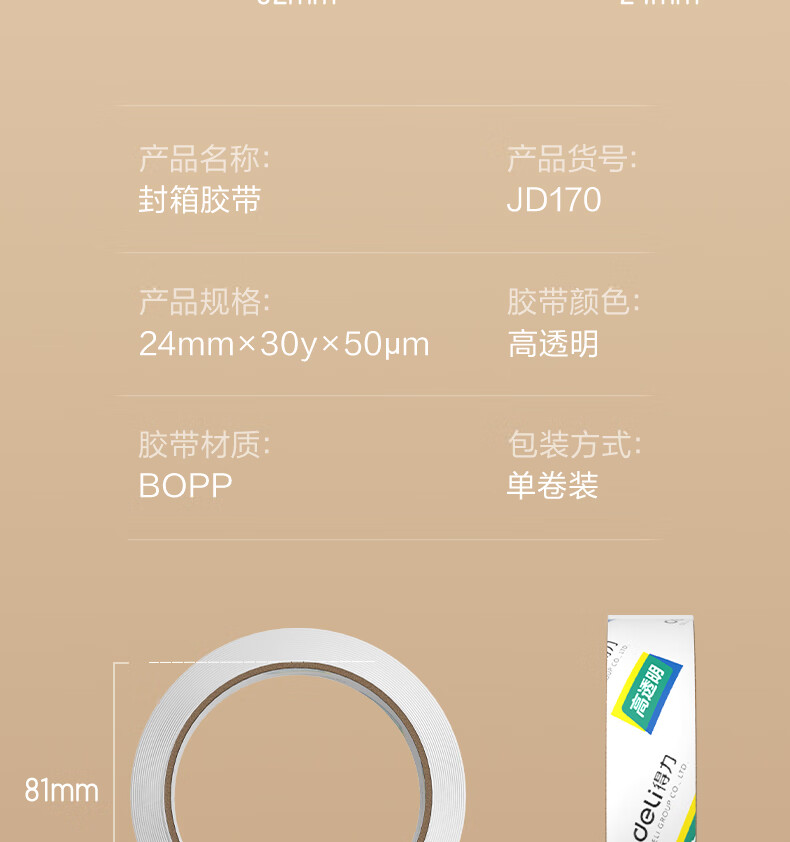 得力/deli JD171 胶带 高品质高透明封箱胶带打包胶带24mm*40y*50um 单卷装