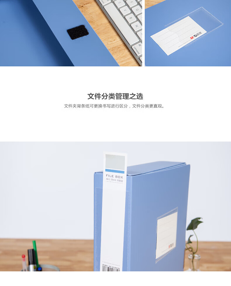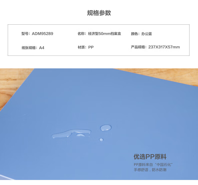 包装清单  :   A4档案盒经济型塑料耐用粘扣文件盒资料盒背宽55mm V-ADM95289B2深蓝色1个装