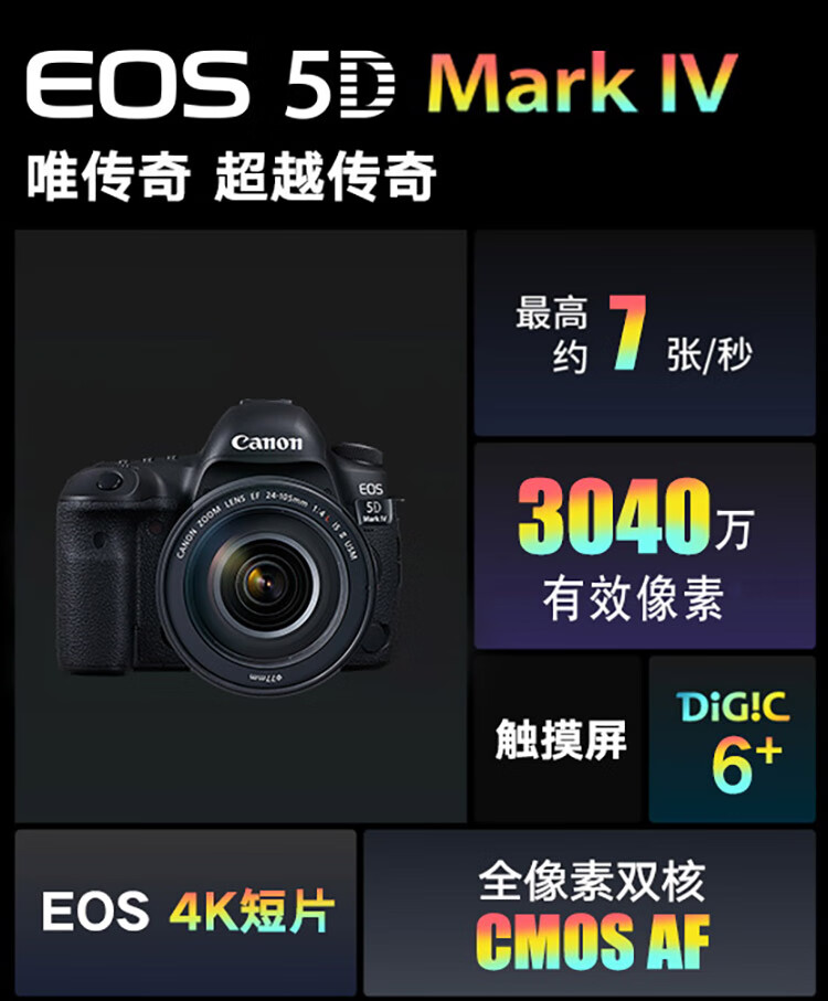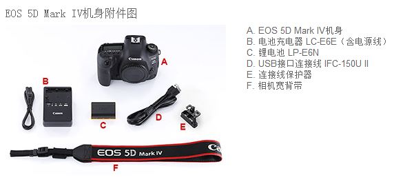 包装清单  :   EOS 5D Mark IV机身×1,电池充电器 LC-E6E(含电源线)×1,锂电池 LP-E6N×1,USB接口连接线IFC-150U II×1,连接线保护器×1,相机宽背带×1,EF 24-105mm f/4L IS II USM×1,
