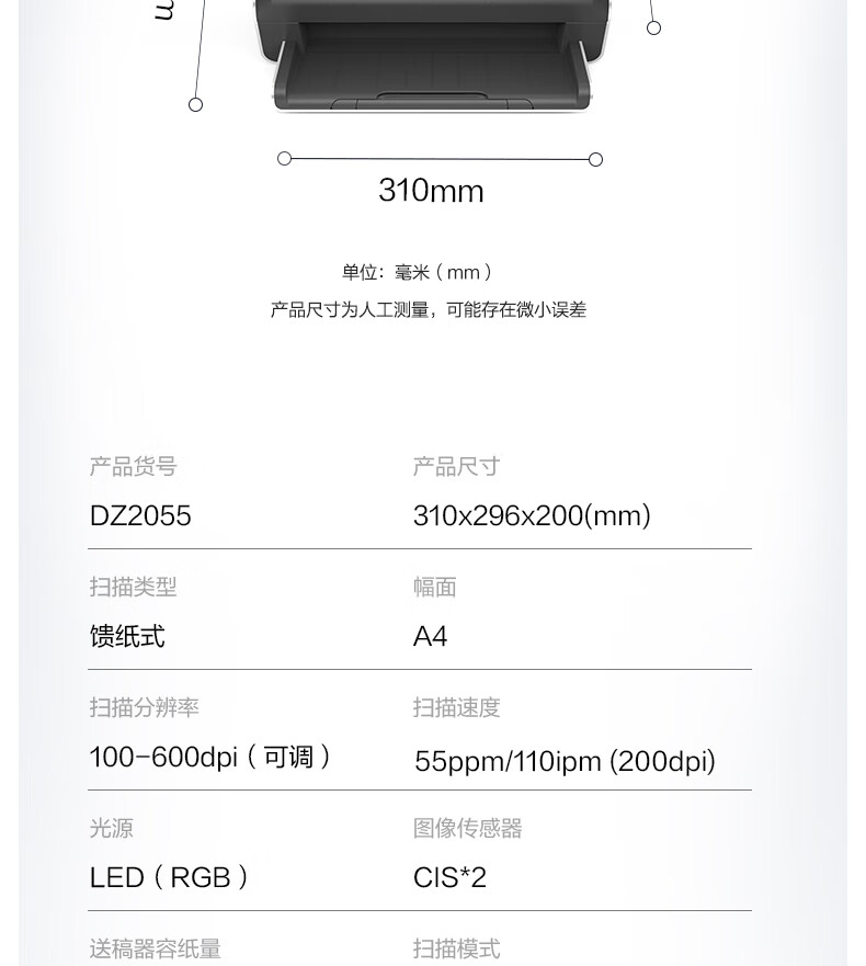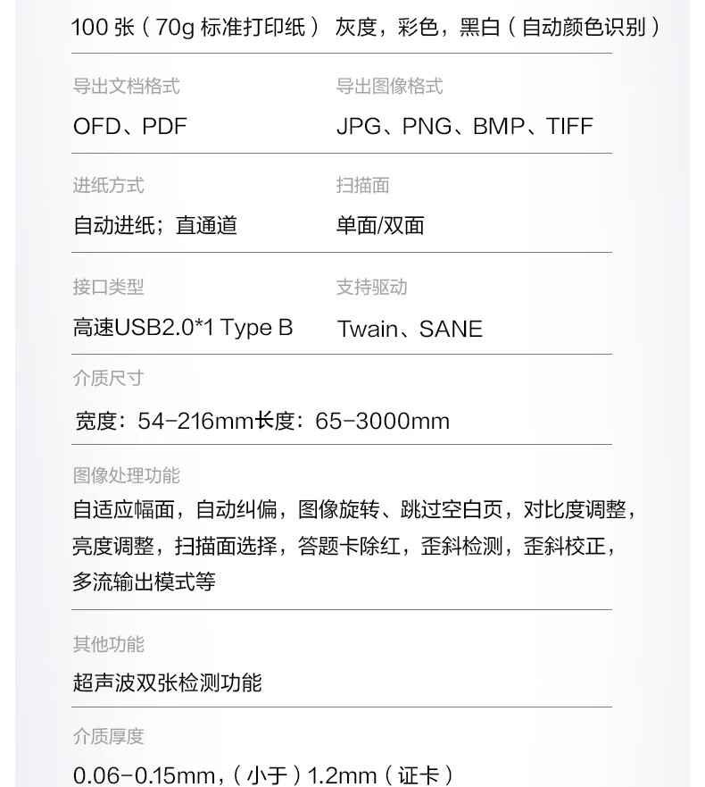 ADF彩色双面扫描速度(A4,200dpi)  :   100