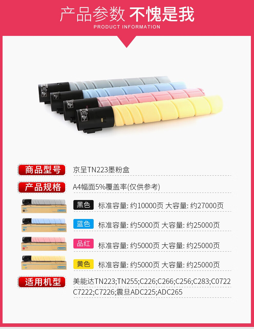 适用机型  :   美能达TN223:TN255:C226:C266 C256 C283:C0722C7222 C7226 震日ADC225 ADC265