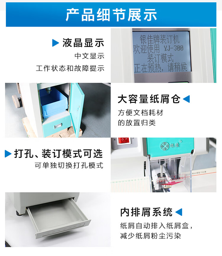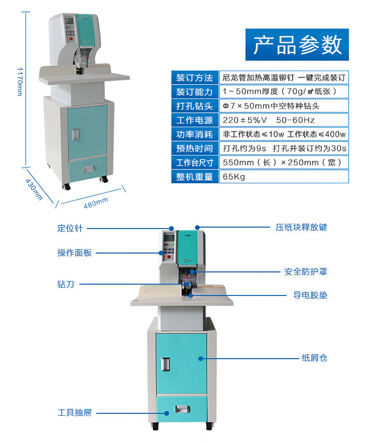 包装清单  :   装订机×1、电源线×1、使用说明书×1、保修卡×1、保险丝×1、垫片×1、合格证×1、铆管×10、随机工具×1、钻刀×2(以实际装订清单为准)