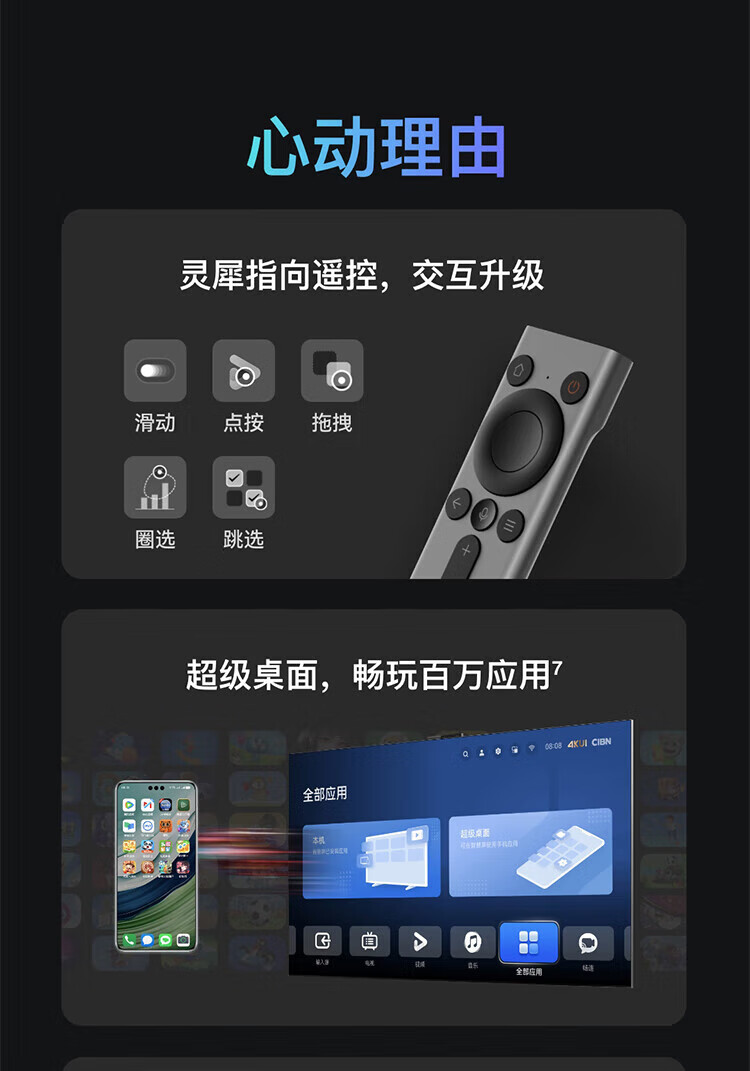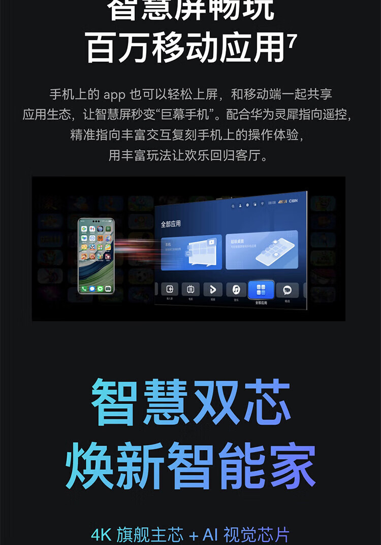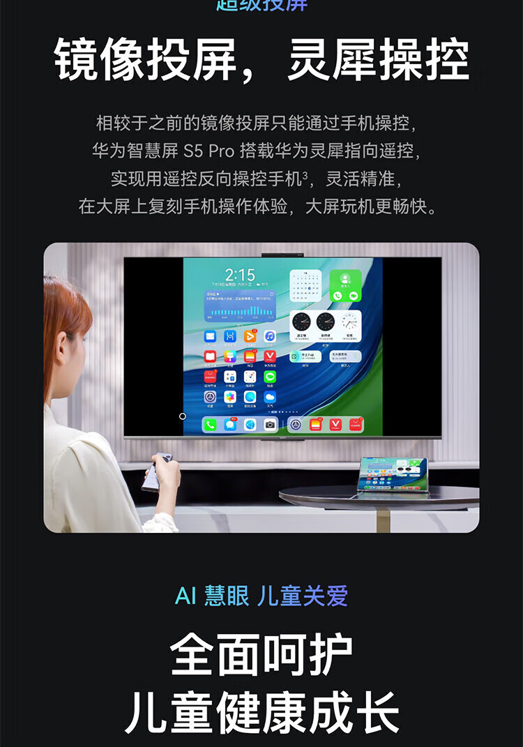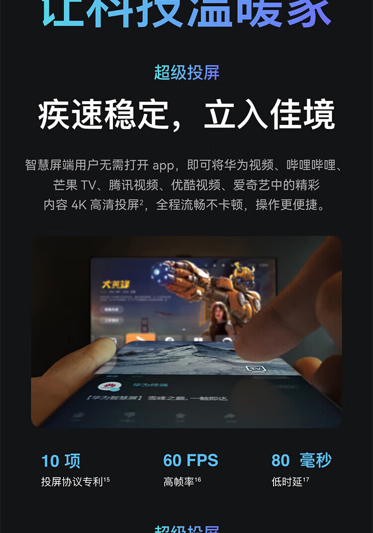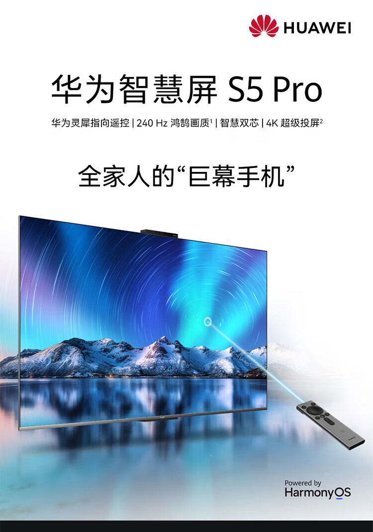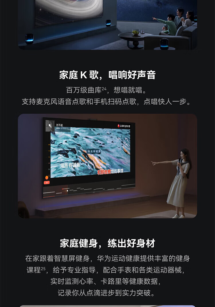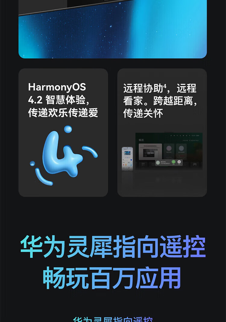 包装清单  :    1)整机 × 1; 2)底座 × 2; 3)底座螺丝 × 4; 4)华为灵犀指向遥控 × 1; 5)电源线 × 1;