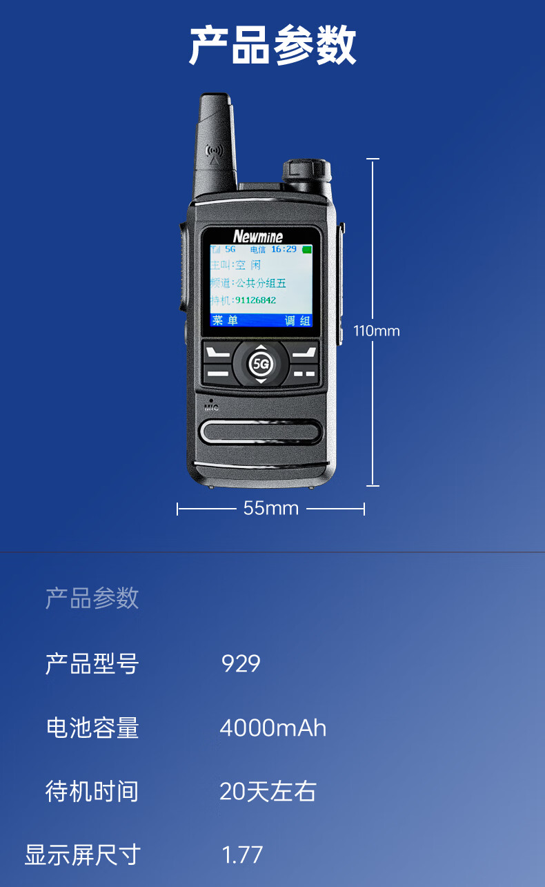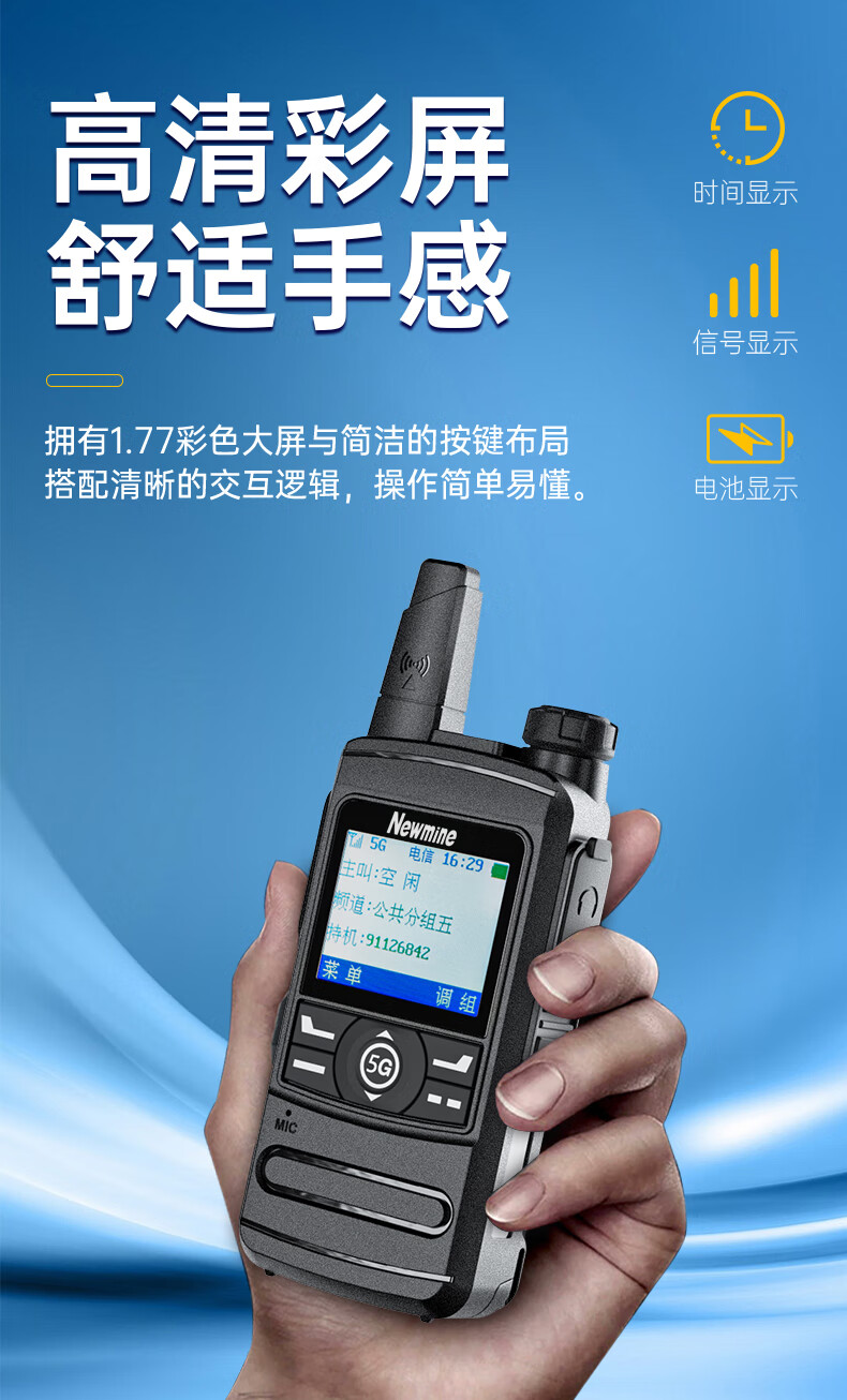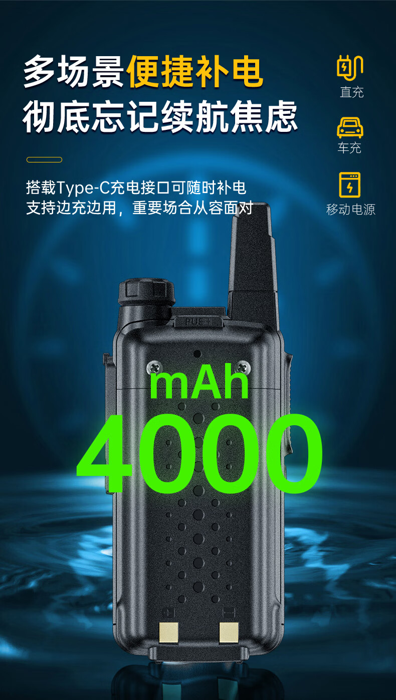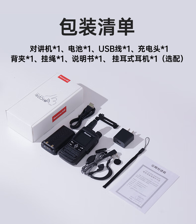 包装清单  :   对讲机*1、电池*1、挂耳式耳机*1、USB线*1、充电头*1、背夹*1、挂绳*1、说明书*1