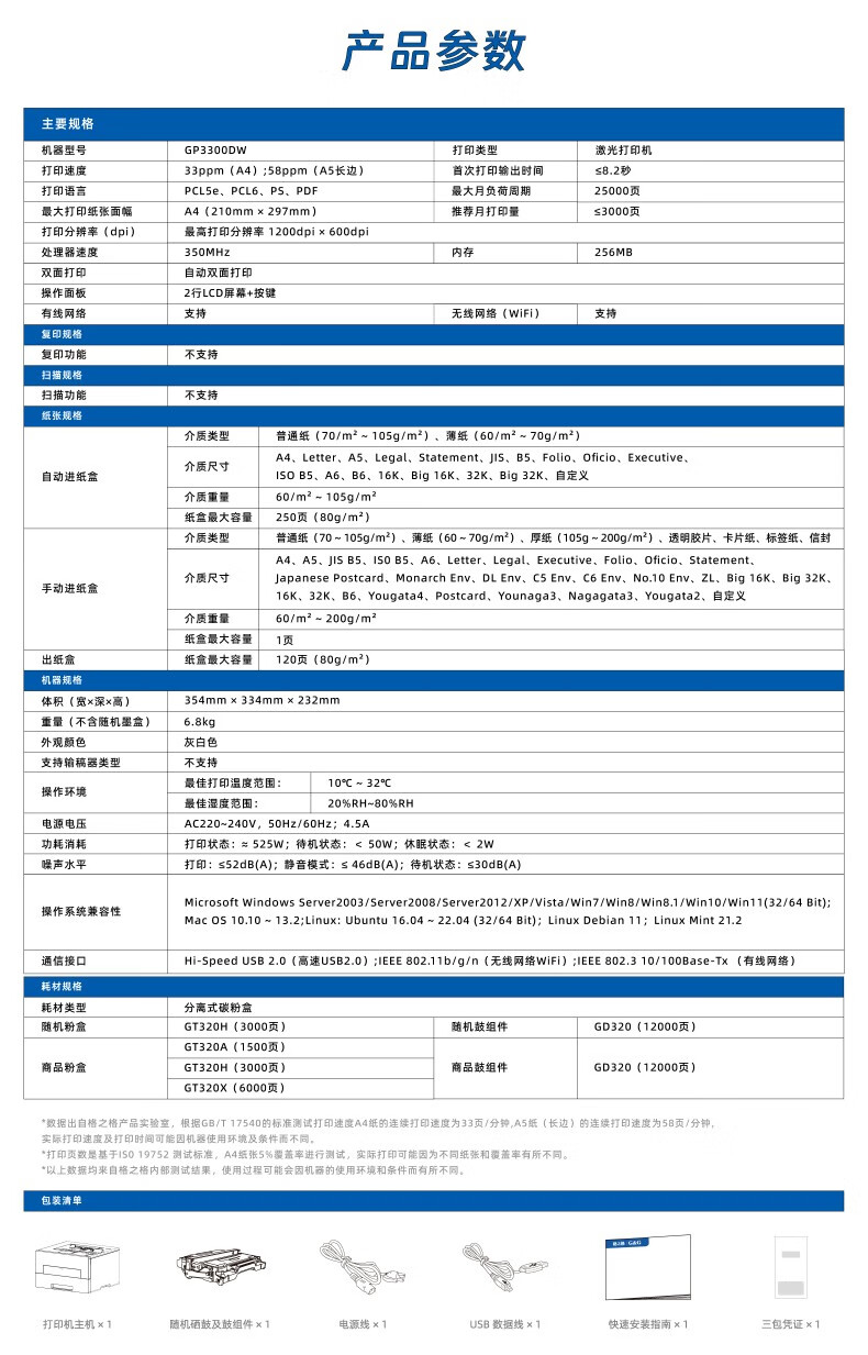 包装清单  :   打印机主体*1、随机硒鼓及鼓组件*1、电源线*1、USB数据线*1、快速安装指南*1、三包凭证*1