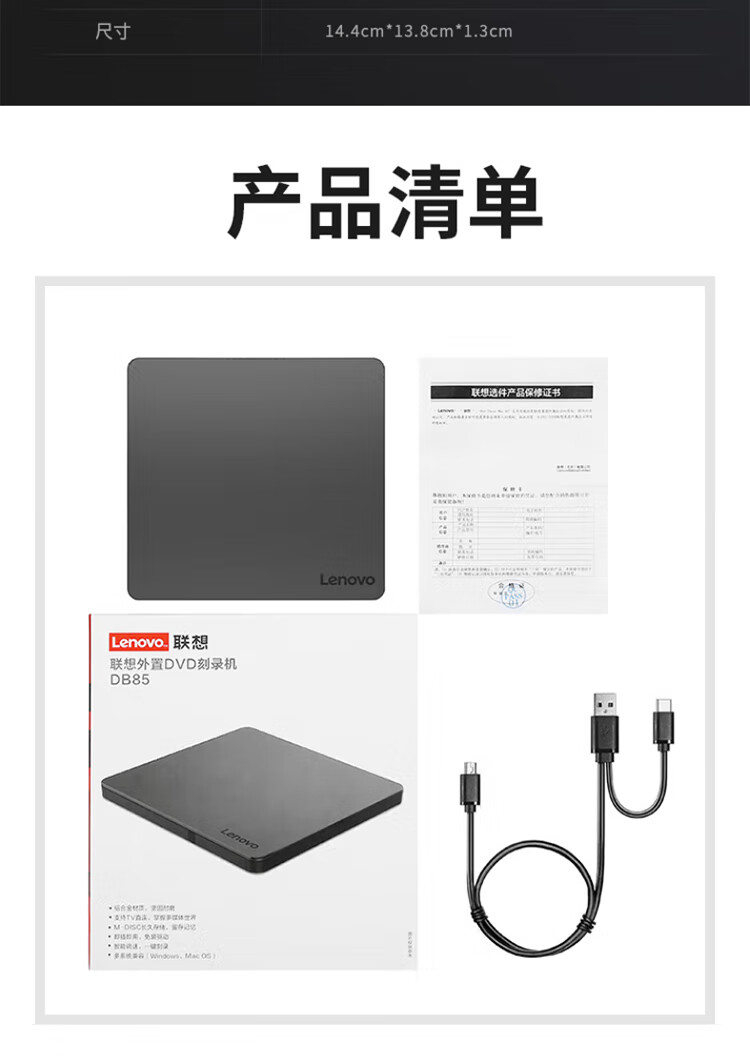 包装清单  :   铝合金外置DVD刻录机 × 1 数据线× 1 产品保修证书 × 1