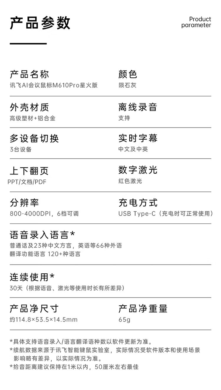 包装清单  :   M610Pro星火版鼠标*1、接收器*1、充电线*1、说明书*1