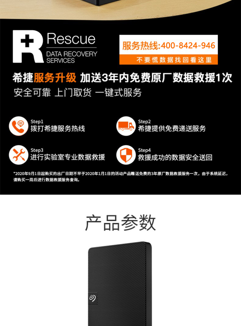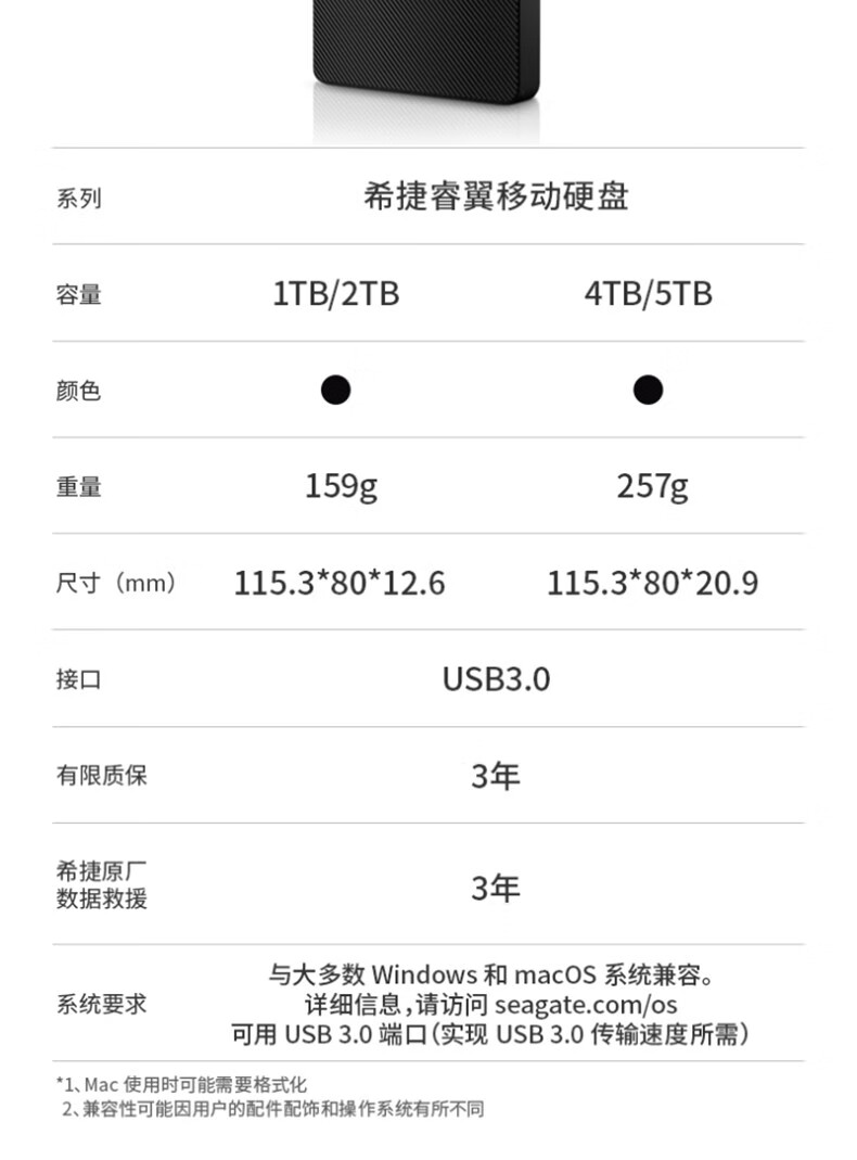 包装清单  :   1、Seagate® Expansion 便携式硬盘 2、长 18 英寸(45.72 厘米)的 USB 3.0 连接线 3、快速入门指南