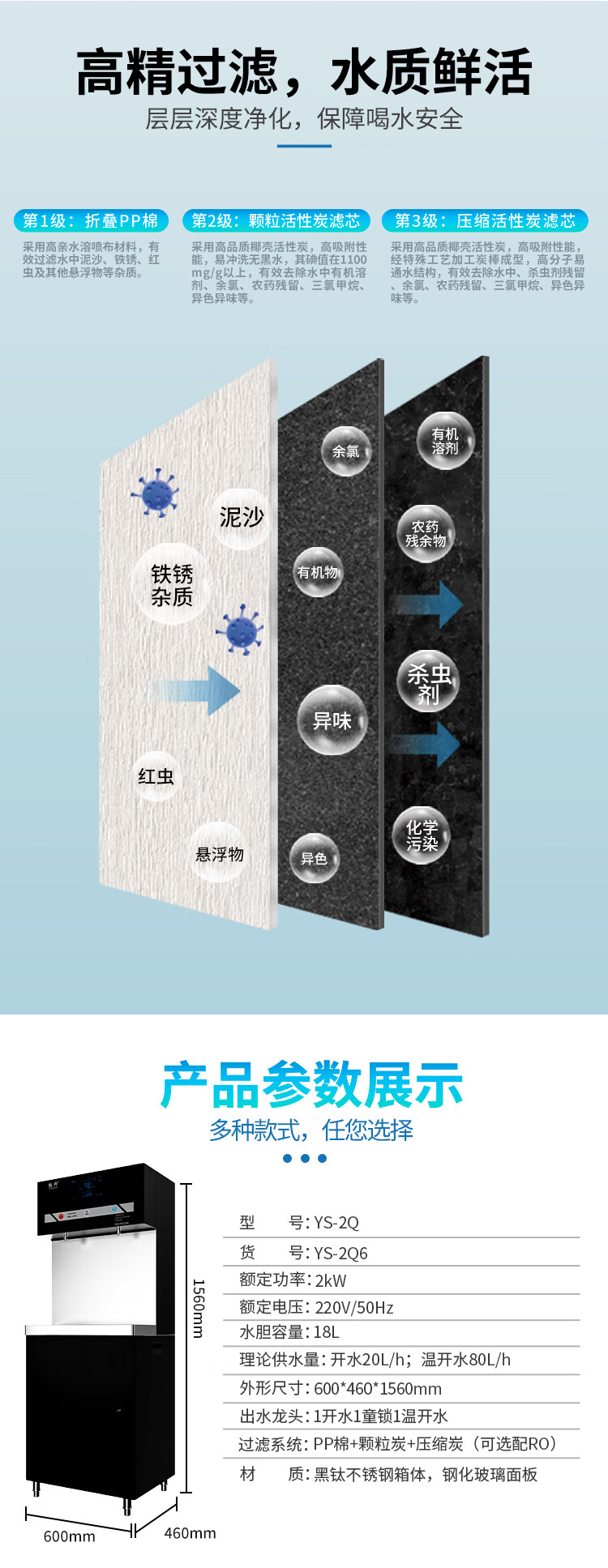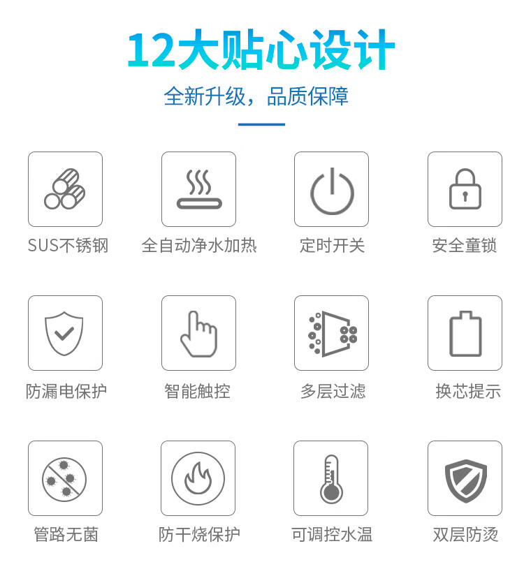 显示 | 温度、星期、时间、水位、饮用、加热、进水、水质监测、滤芯实时显示 |