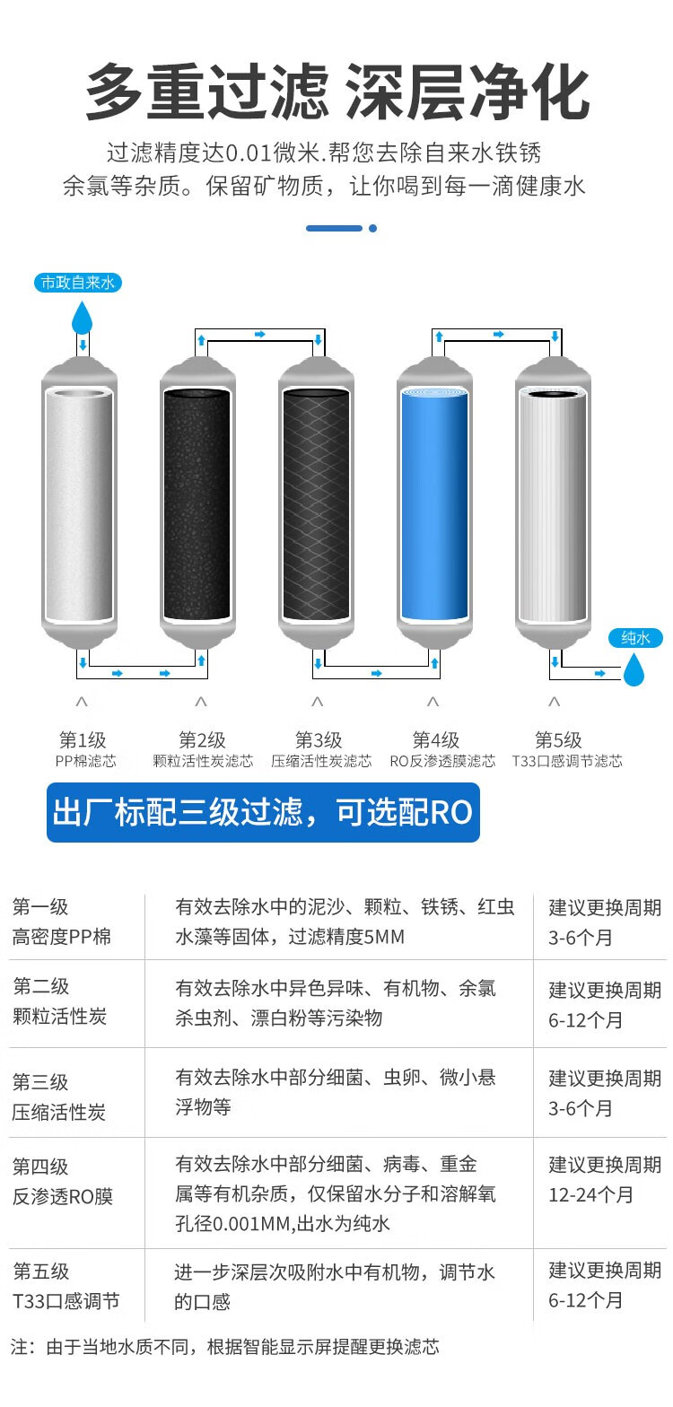 第一级 5微米聚丙烯熔喷滤芯(9.5寸) 第一道接触原水装置,孔径为5微米PP棉滤芯,有效滤除原水中的较粗固体物质(如铁锈、泥沙、水藻等)使水质初步净化。 第二级 颗粒活性炭(9.5寸) 高效吸附、祛除水中的异色、异味,余氯和有机物。 第三级 压缩活性炭(9.5寸) 进一步深层次滤除前两级过滤水中的剩余颗粒物。确保进入(RO)反渗透膜的水不会堵塞孔径,有效保护核心(RO)反渗透膜,延长使用寿命,确保水质稳定。 第四级 反渗透膜(RO400膜) 经三级预处理后的水,经增压泵加压进入第四级反渗透膜。本纯水机采用RO膜作为主要过滤原件,RO膜是依靠机器对原水所施加的压力使原水中水分子透过,由于RO膜的孔径仅0.0001微米,一个细菌要缩小四千倍,传染性病毒也要缩小200倍以上才能通过,因此水中所有杂质、可溶性固体、细菌及病毒都无法渗过高密度的反渗透膜;而把原水中细微杂质,过多的无机盐,有机物,重金属离子,细菌、病毒、农药、三氯甲烷废物等其它有害物质统统截留下来,并通过废水口将这些水中有害异物及盐分排出,进而得到十分纯净的饮用水,达到直饮水标准。 第五级 后置活性炭(T33) 采用椰壳活性炭,进一步祛除水中的异味,增加水中含氧量,使水质口感轻柔,回味甘甜。 | ||