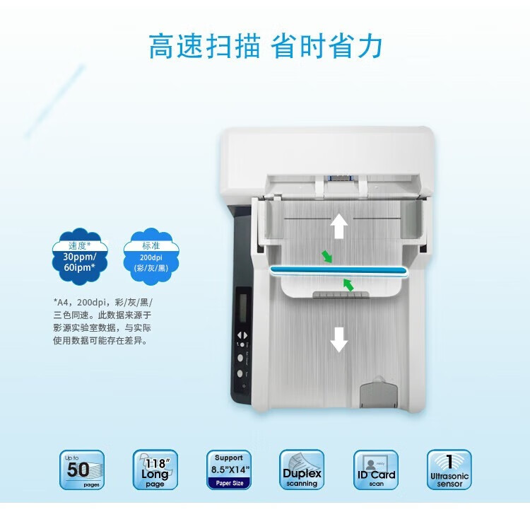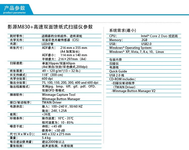 ADF彩色双面扫描速度(A4,200dpi)  :   200