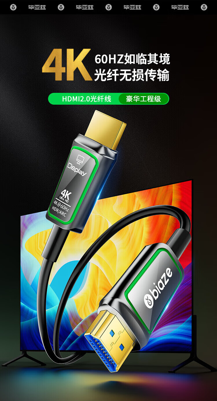 毕亚兹 BIAZE 光纤HDMI线2.0版 4K发烧级高清线 电脑电视投影仪家庭影院3D视频连接线 5米 HX88 光纤HDMI线【4K60Hz】工程款 【5米】