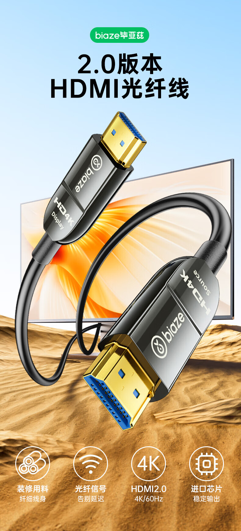 毕亚兹 光纤HDMI线2.0版 4K60Hz发烧级高清线 电脑连接电视投影仪显示器3D视频线工程装修连接线HX112 光纤HDMI线【4K60Hz】合金款 10米