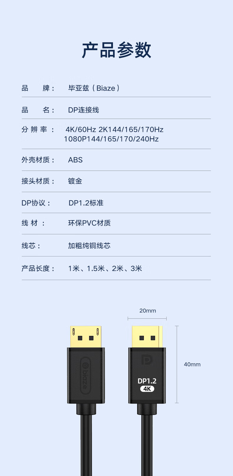 包装清单  :   DP线1.2版 4K60HZ高清公对公2K/144Hz连接线 台式机电脑显卡笔记本连接显示器视频线 DP1.2版高清4K60HZ【办公款】 3米