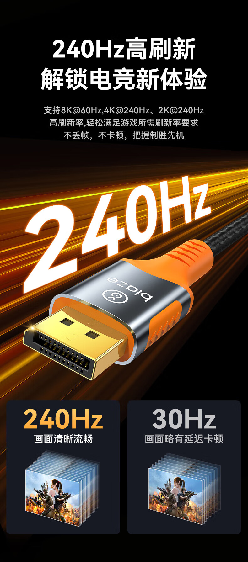毕亚兹DP线1.4版/2.1版8K高清4K240Hz 2K240/165HzDisplayPort电脑游戏电竞显示器视频线 HX113-1m 【纯铜高刷款】DP编织-8K铝合金 1米