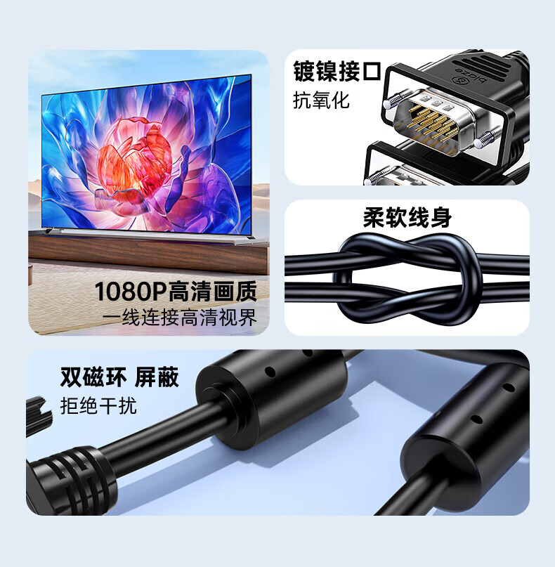包装清单  :   高清VGA线 双磁环黑头vga3+6线芯针 电脑投影仪显示器视频线数据信号线XL45 VGA线《3+6线芯》加粗黑色 1.5米
