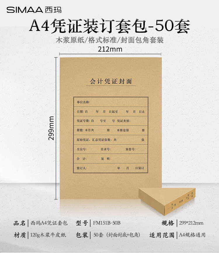 西玛(SIMAA)A4竖版凭证封面套包 50套(封面封底 包角)120g 212*299mm a4记账凭证报销粘贴单据