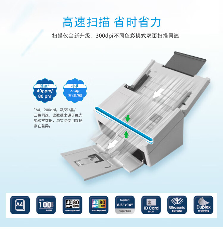 ADF彩色双面扫描速度(A4,200dpi)  :   40
