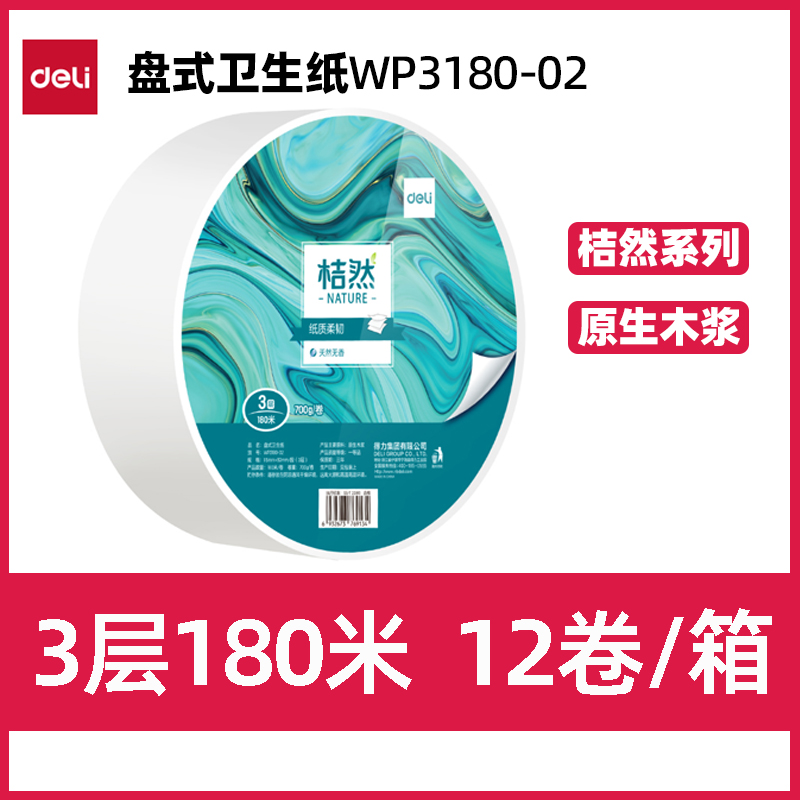 得力/deli WP3180-02 卷类卫生纸 桔然盘式卫生纸3层180米(白色)(卷) 有芯卷纸 10卷