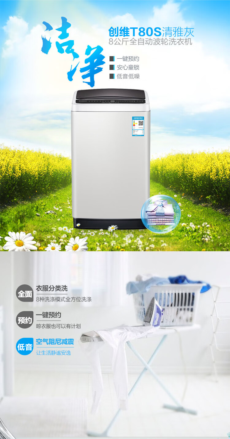 创维/Skyworth T80S 洗衣机 8公斤全自动洗衣机 T80S清雅灰 10种程序8档水位 桶自洁+桶风干 拒绝二次污染 浅灰色