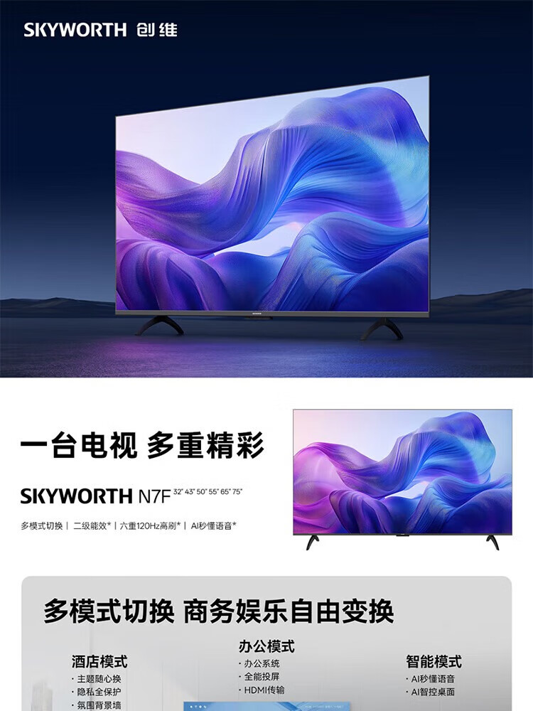 创维/Skyworth 43N7F 普通电视设备(电视机)网络智能电视 办公 多模式切换 商务娱乐 健康护眼 二级能效 43英寸 平板电视 43英寸