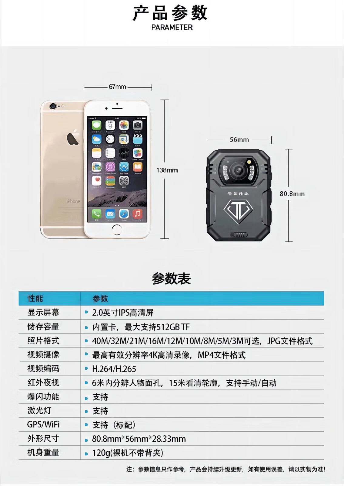 产品材质  :   执法记录仪 WiFi+GPS版 256G