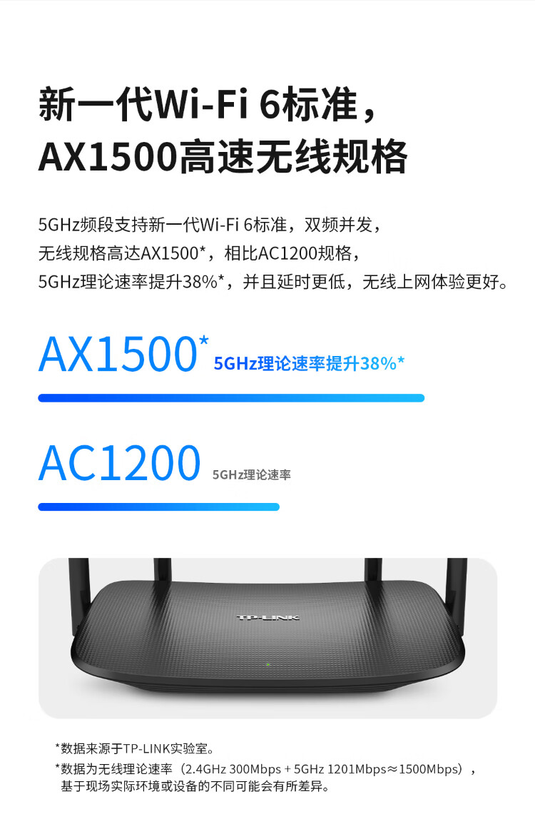 包装清单  :    AX1500双千兆新一代无线路由器 高速穿墙家用双频 凌云系列TL-XDR1520易展版 轻享WiFi6