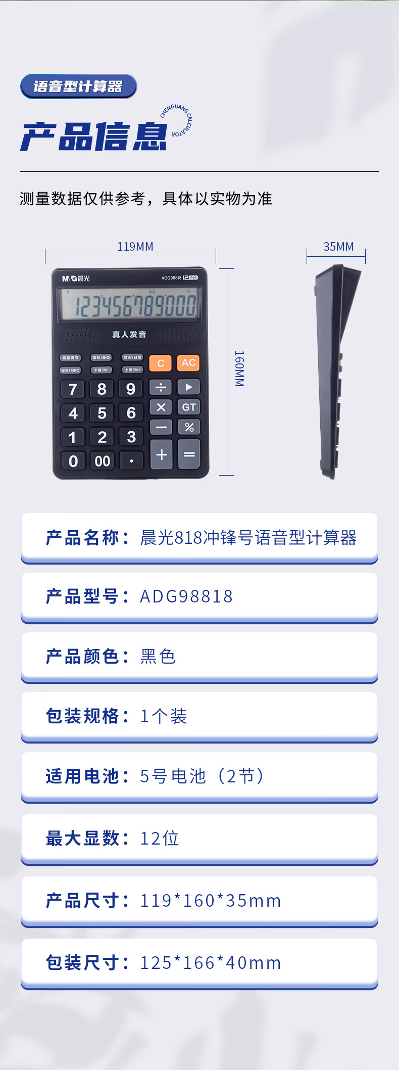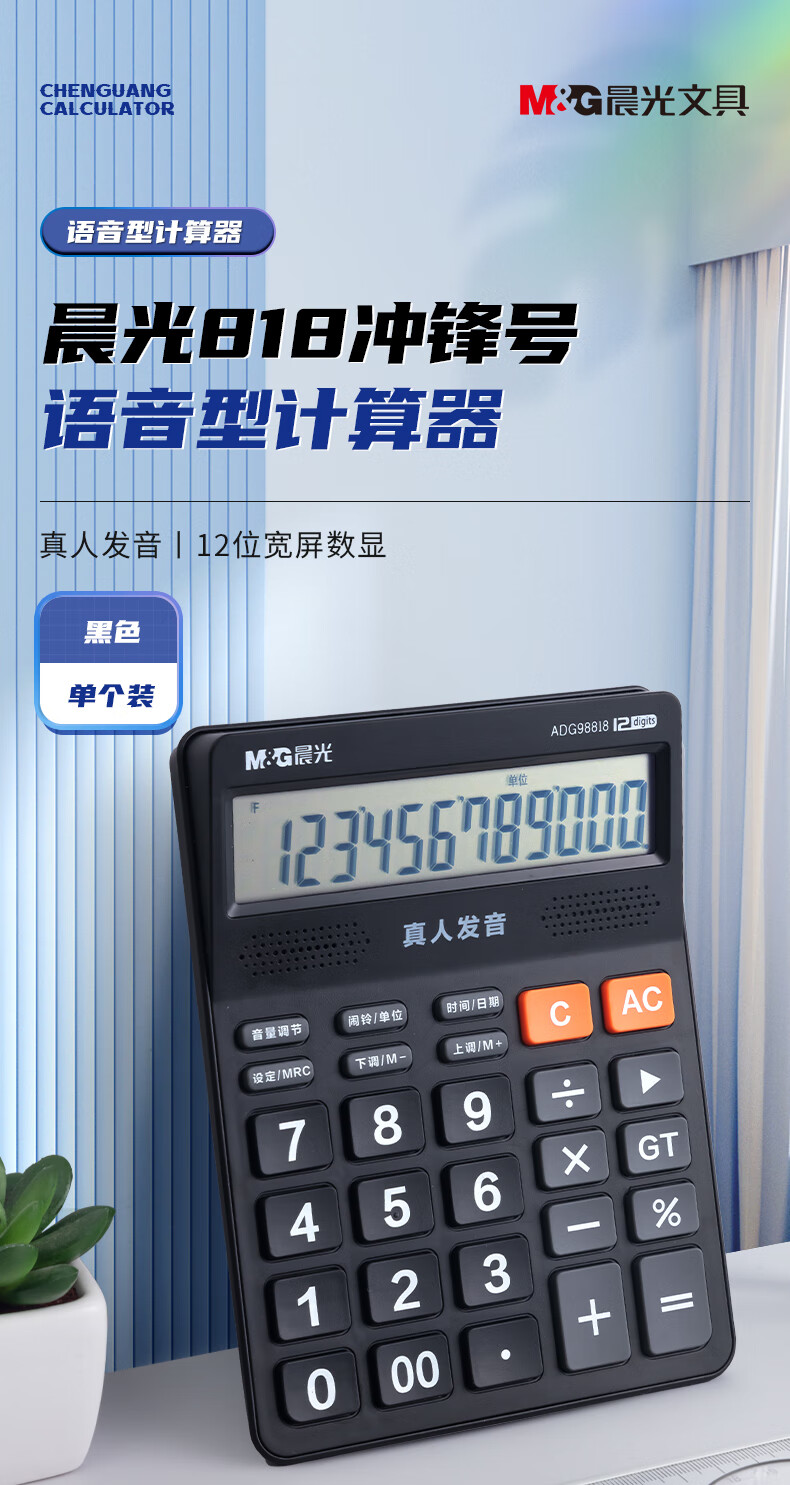 包装清单  :   晨光(M&G)文具黑色语音型计算器 818冲锋号桌面计算机 学生/办公通用12位大屏幕计算器 单个装
