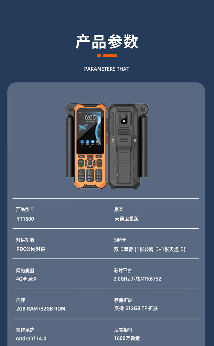 包装清单  :   麟云YT1600 天通卫星电话4G全网通智能降噪户外手持多模终端北斗定位 YT1600橙色