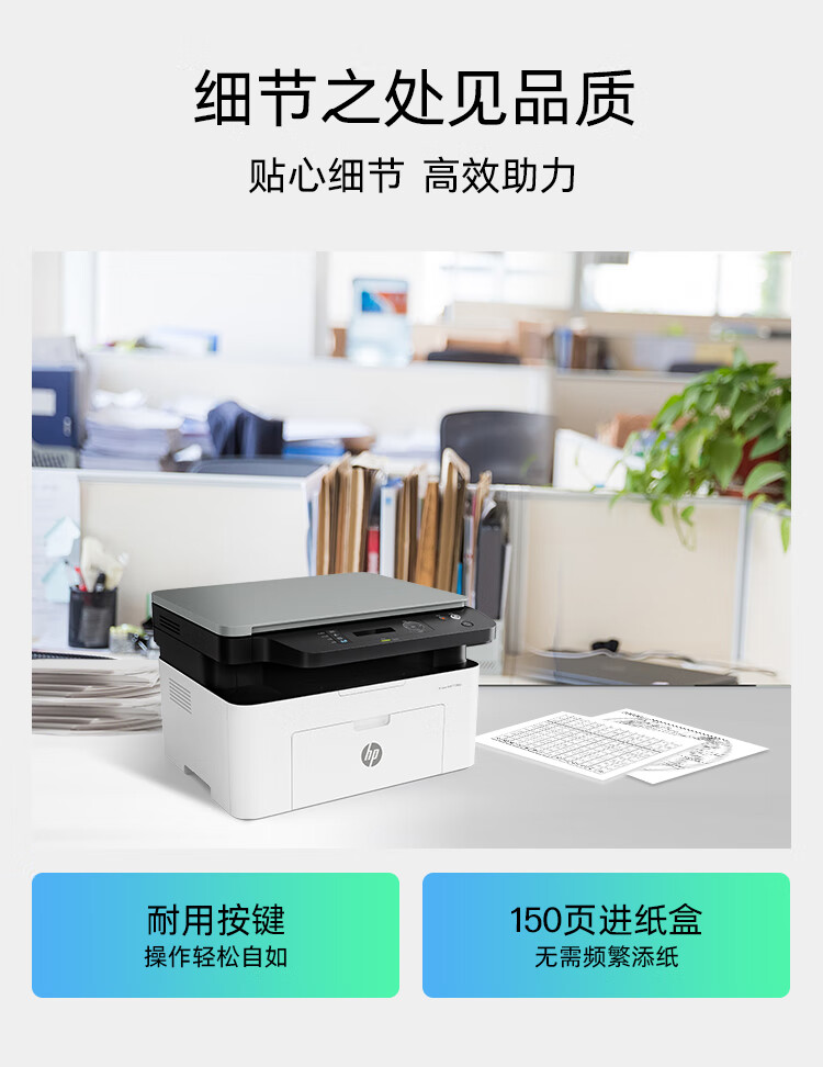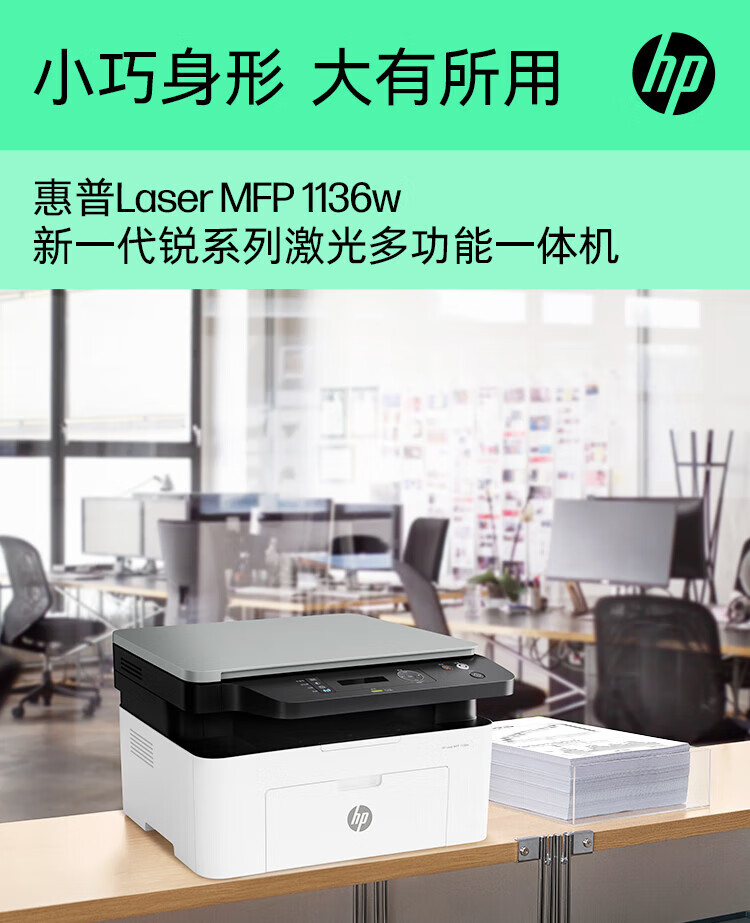 包装清单  :   HP Laser MFP 1136w 激光多功能一体机 预安装的入门级 HP Laser 黑色打印硒鼓(印量约为 1,500 页);安装指南;参考指南;监管要求说明;电源线;USB 数据线