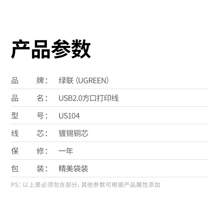 绿联/UGREEN 10329 网络连接设备 绿联 网络连接设备 打印机数据线 USB2.0AM/BM方口接头高速打印线 通用HP佳能爱普生打印机连接线 5米 黑 US104 10329