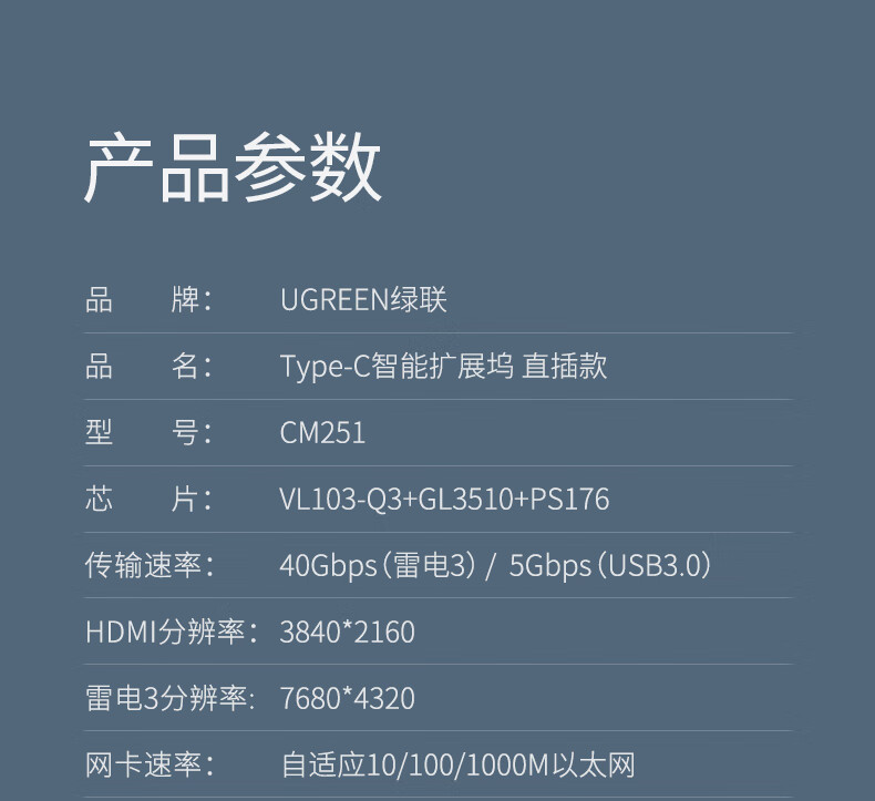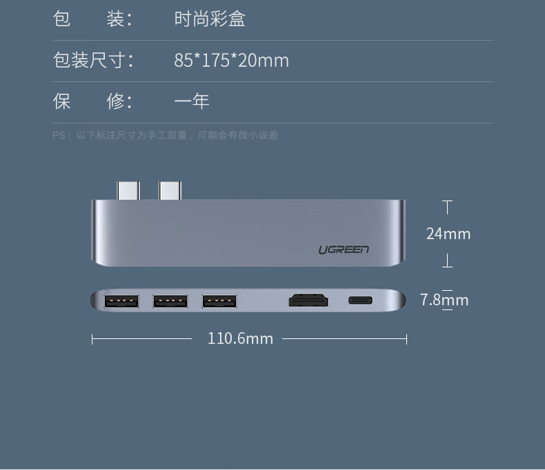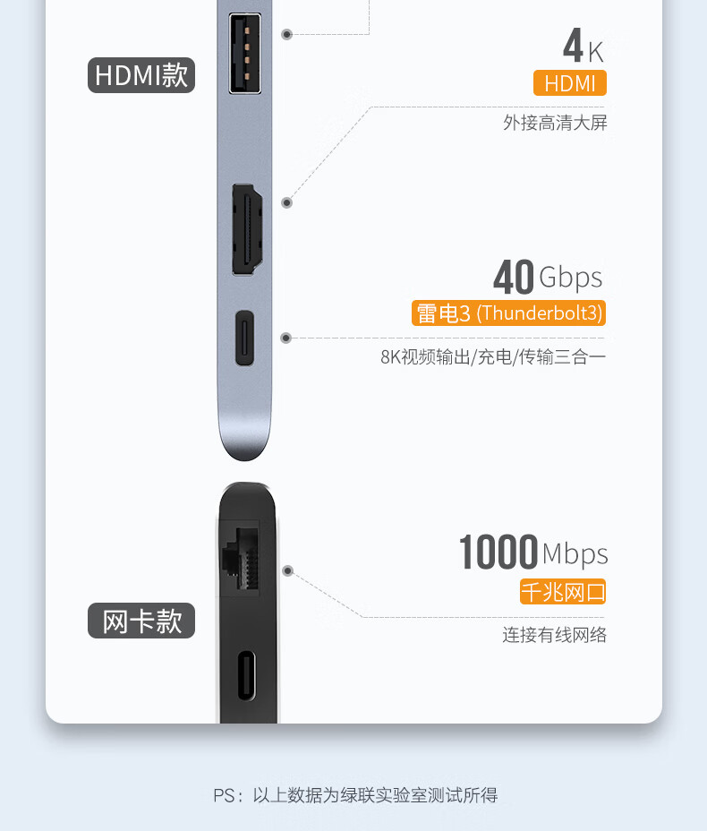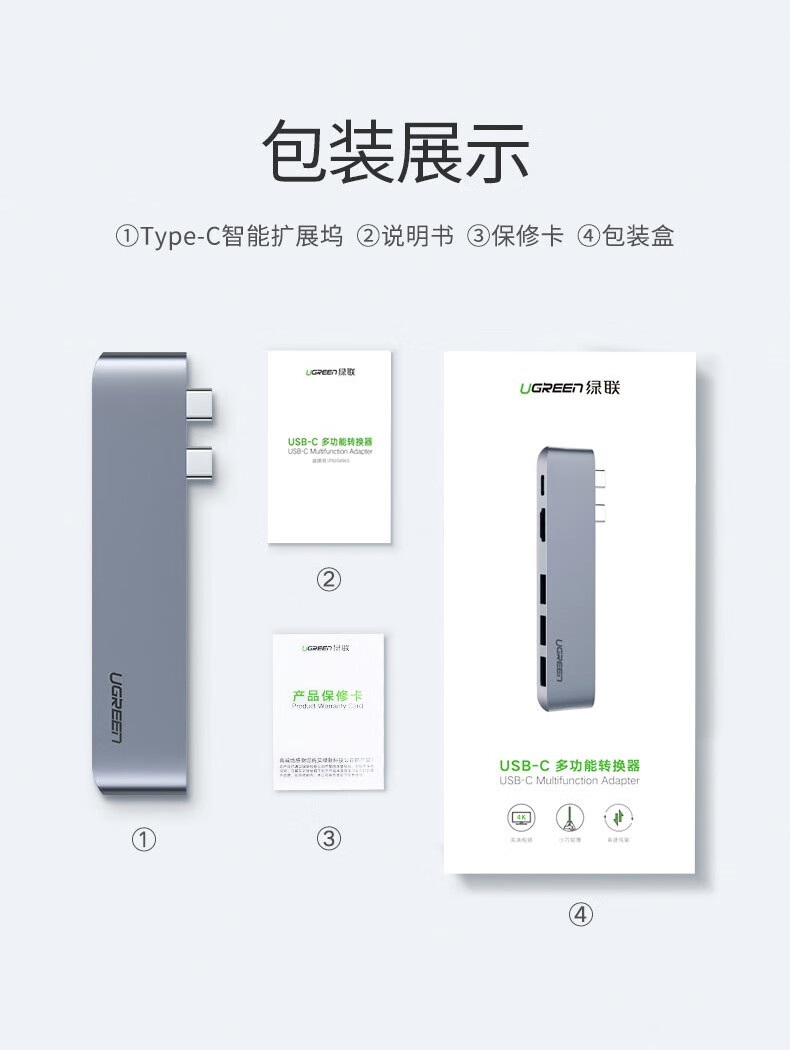 绿联/UGREEN 10914 网络连接设备 绿联 网络连接设备 typec拓展坞扩展usb转接头雷电3hdmi投i影仪网线转接口ma 10914-双头【HDMI款3合1】HDMI+US
