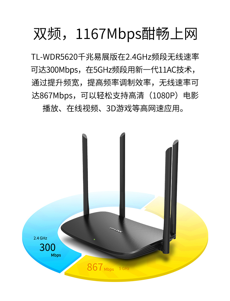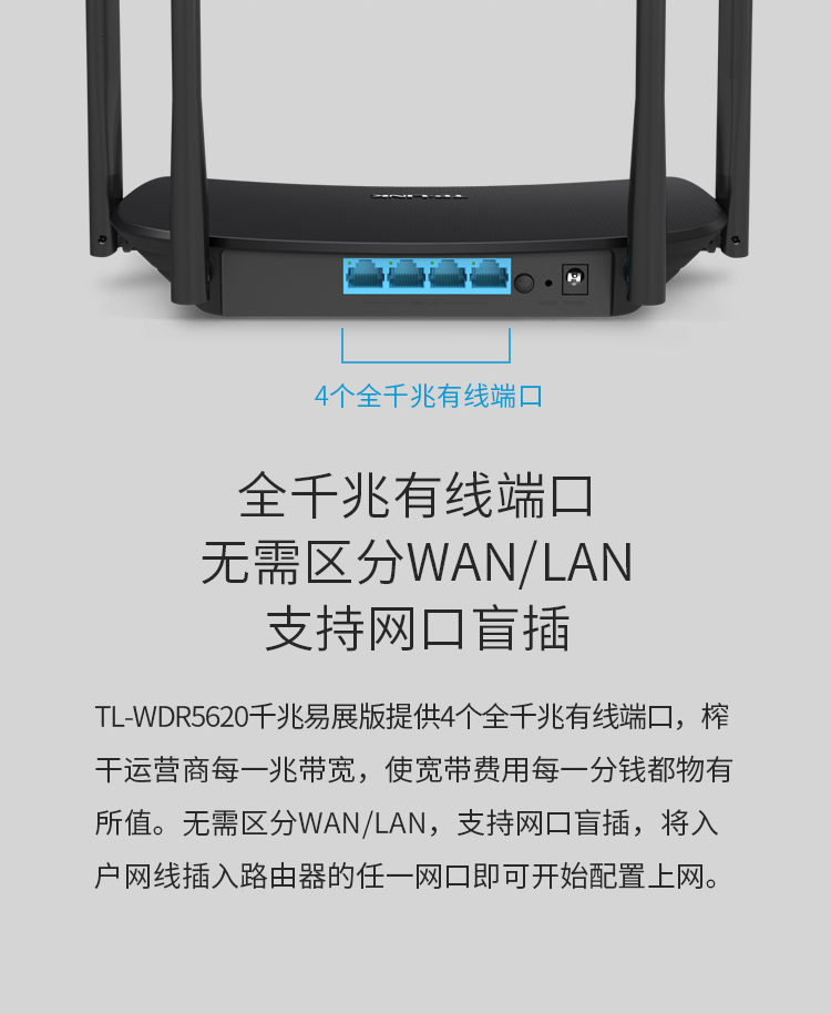包装清单  :   TL-WDR5620千兆易展版× 1、电源适配器× 1、用户手册× 1、千兆网线× 1
