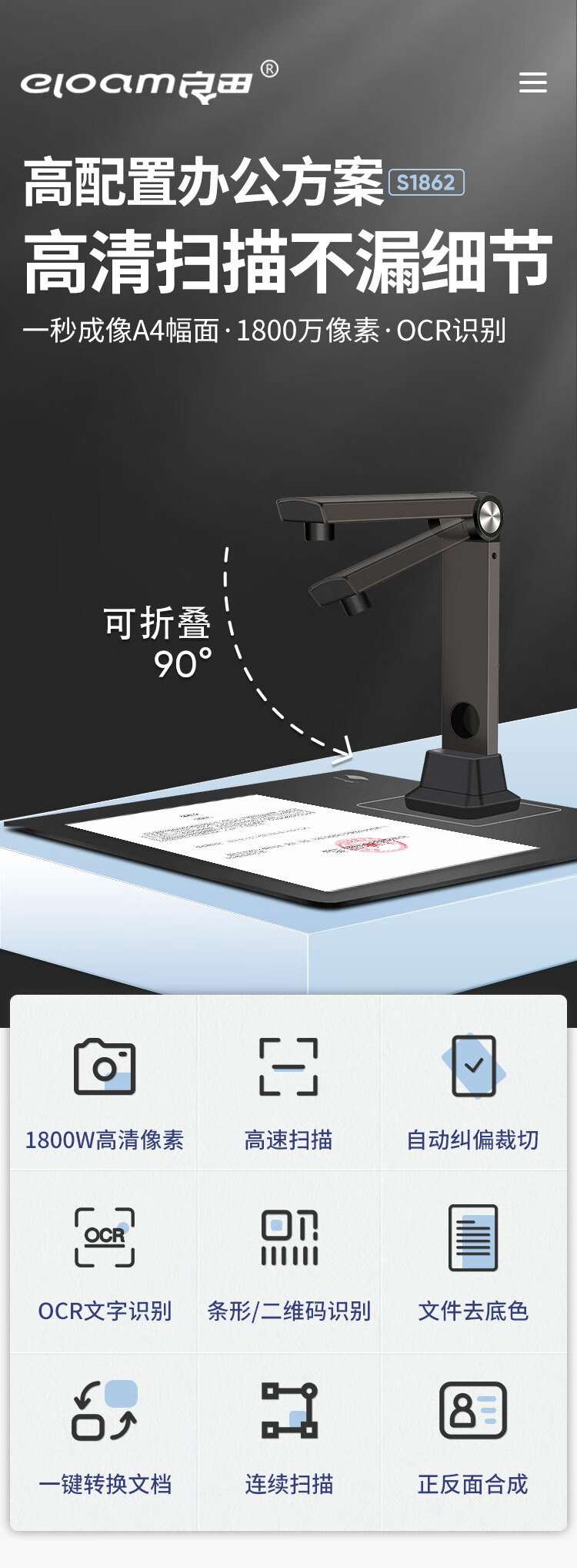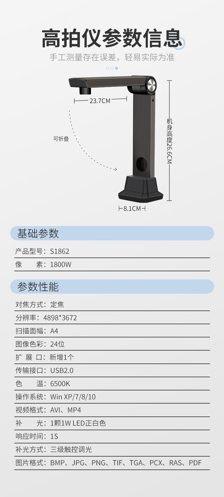 像素(高拍仪)  :   1800W